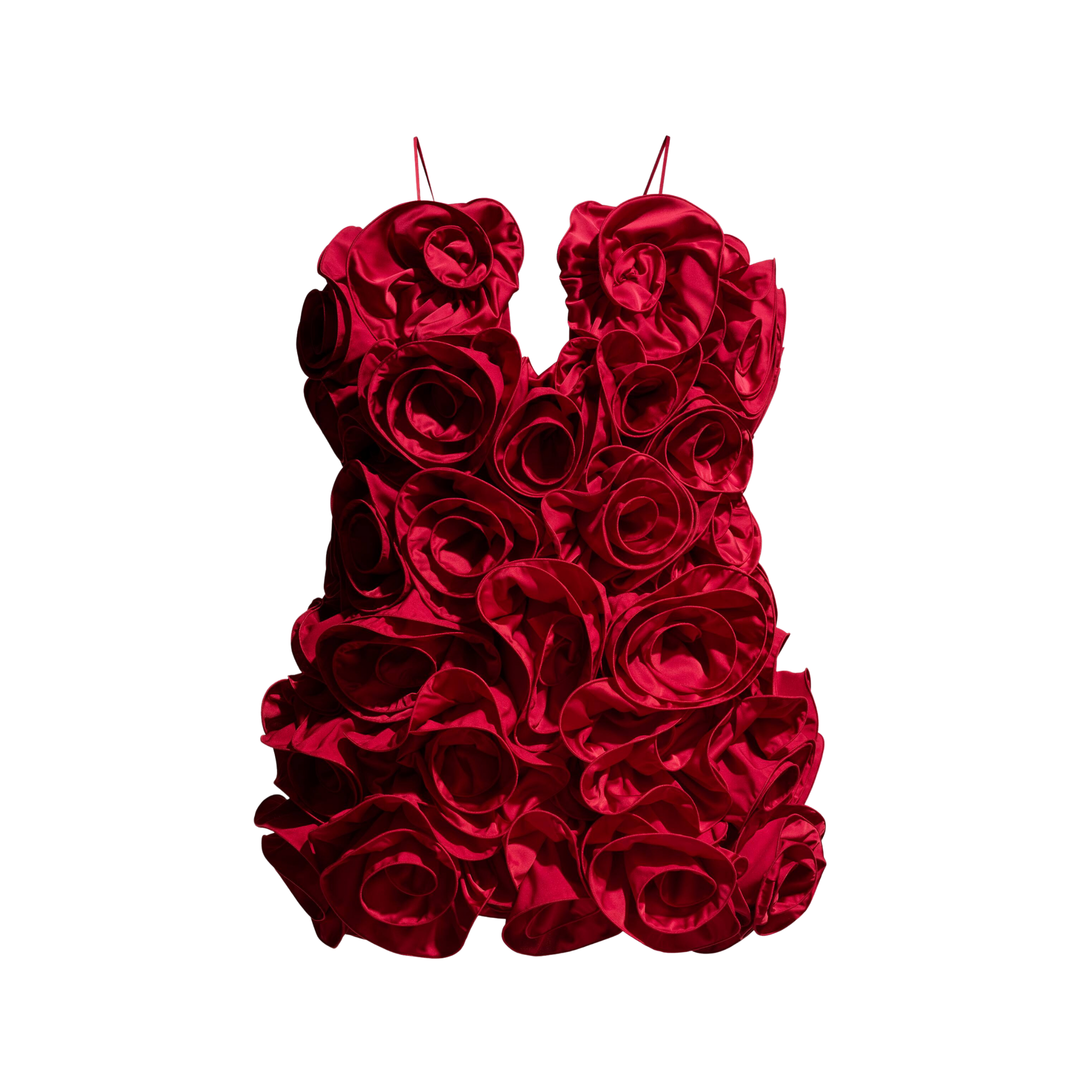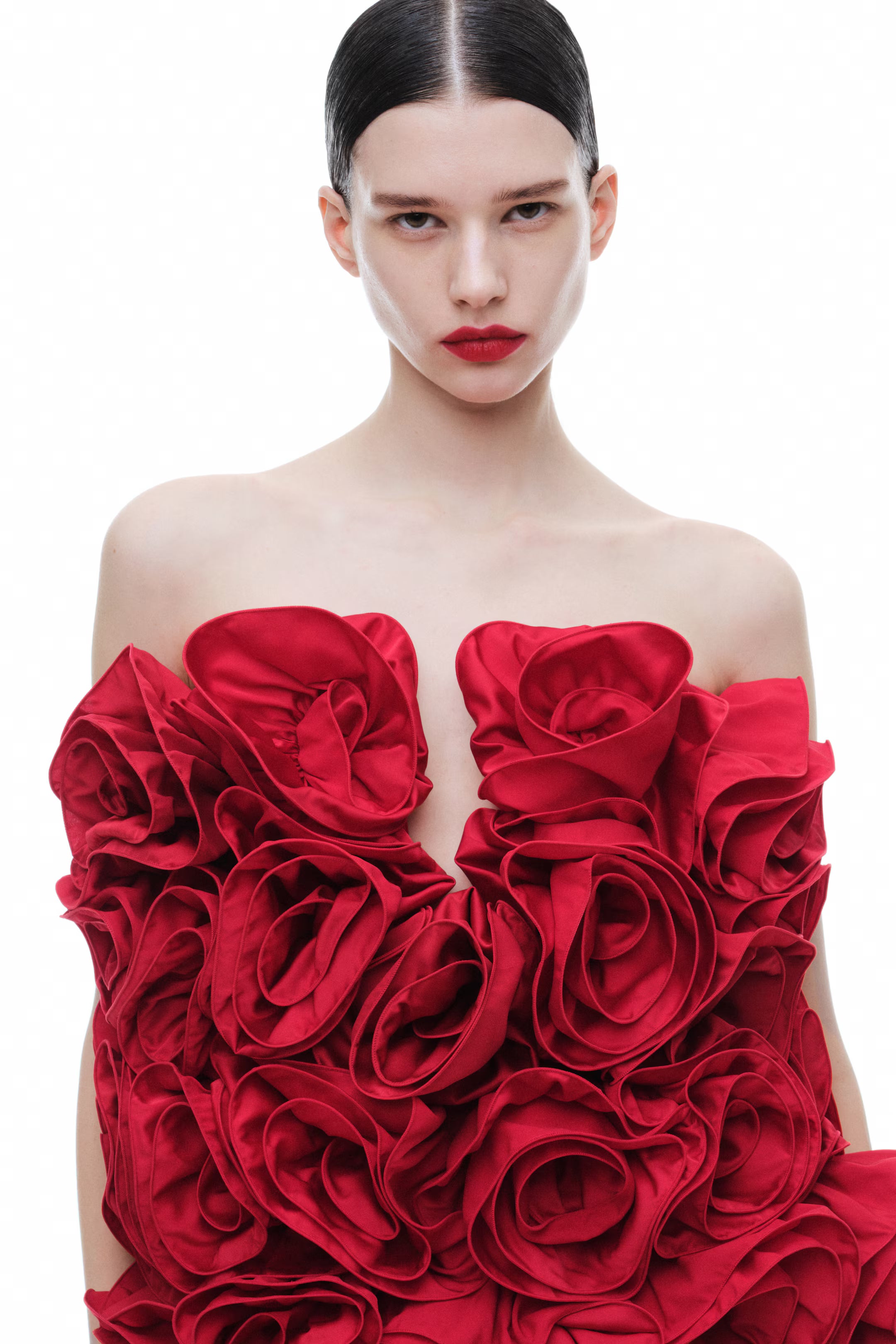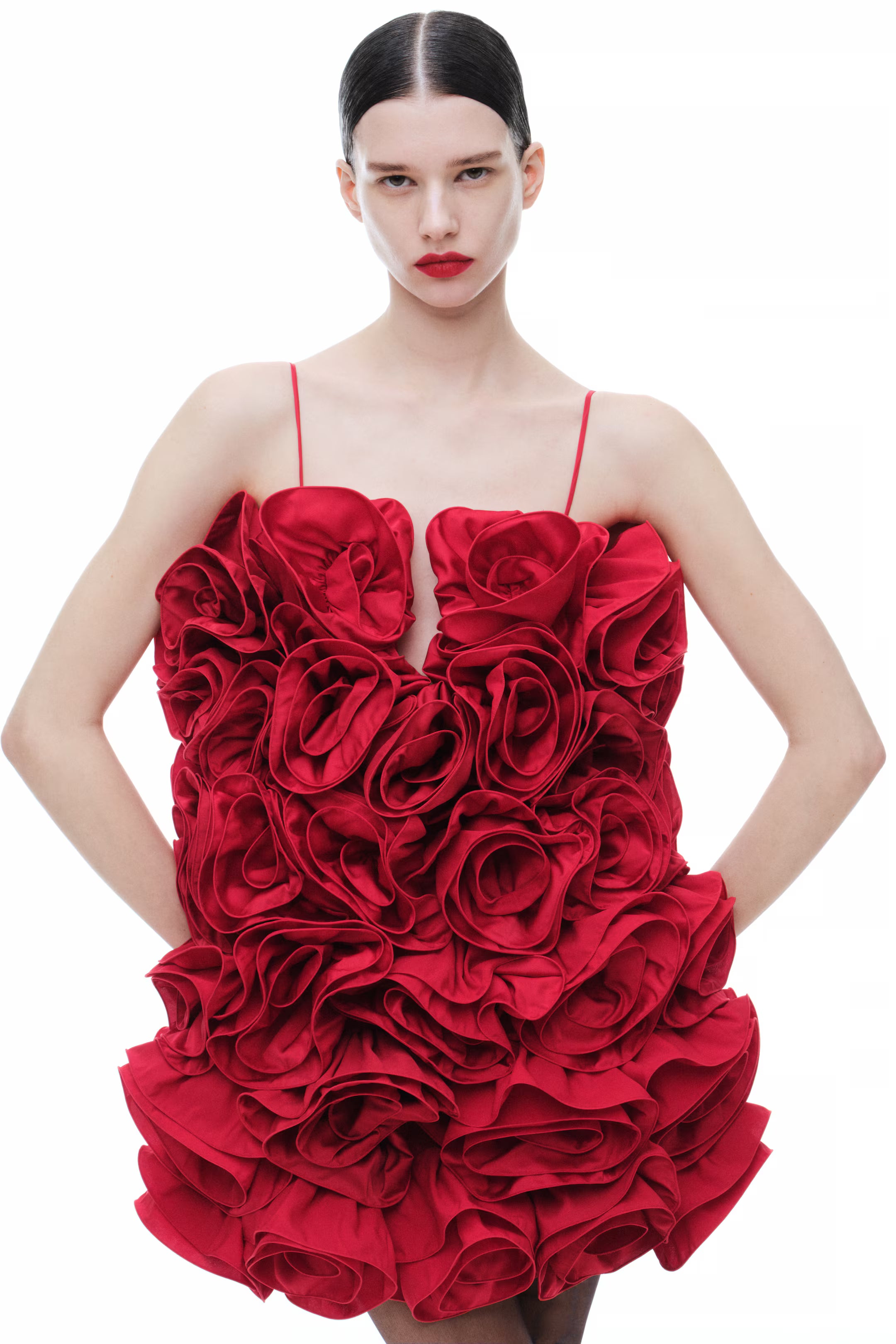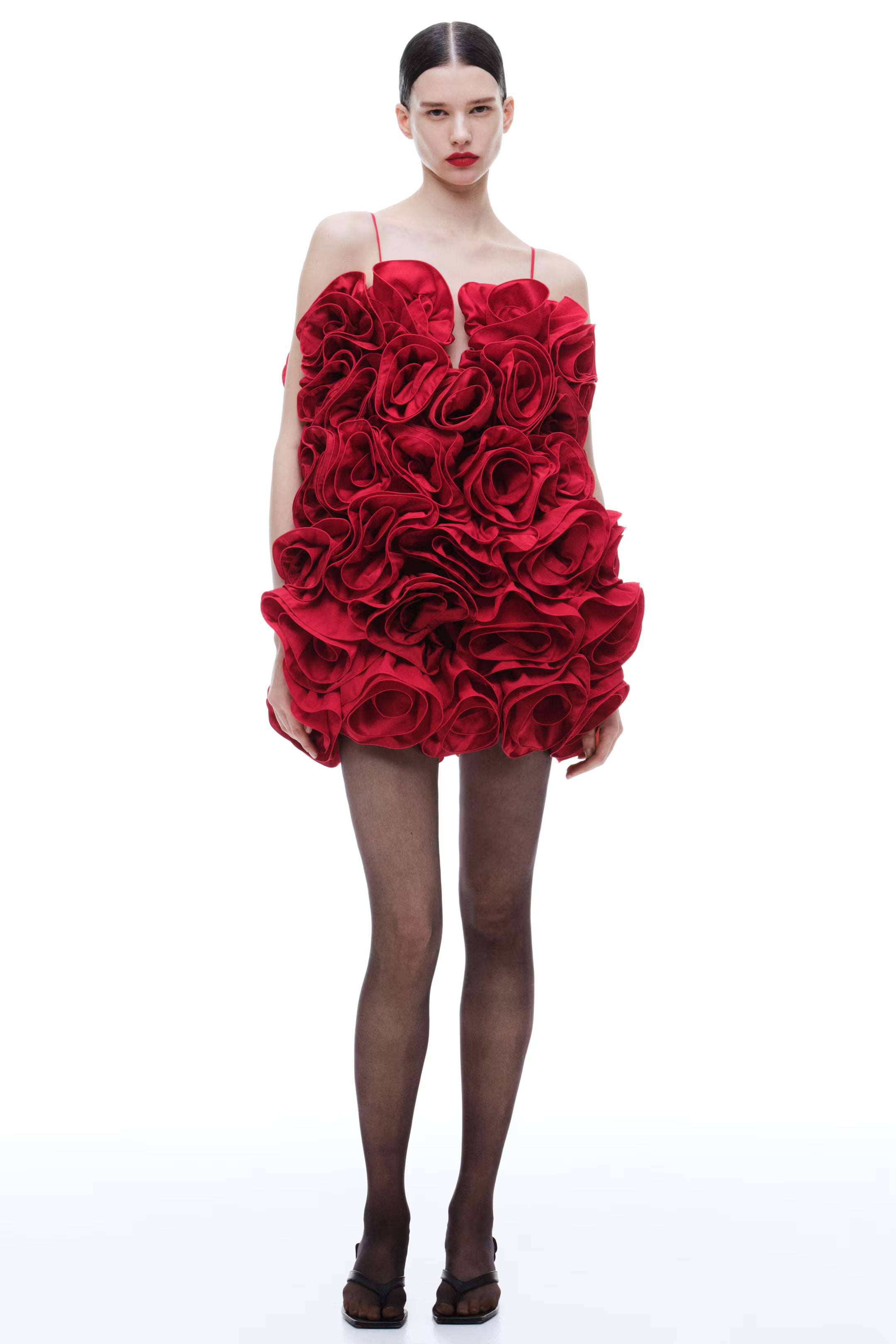 A sculptural mini that feels more like a couture bouquet than a dress, this Magda Butrym x H&M design wraps the body in voluminous satin ruffles for instantly iconic drama. Its vivid red tone and petal-like construction command attention. Perfect for galas, fashion events, statement parties, birthdays, and unforgettable nights out.