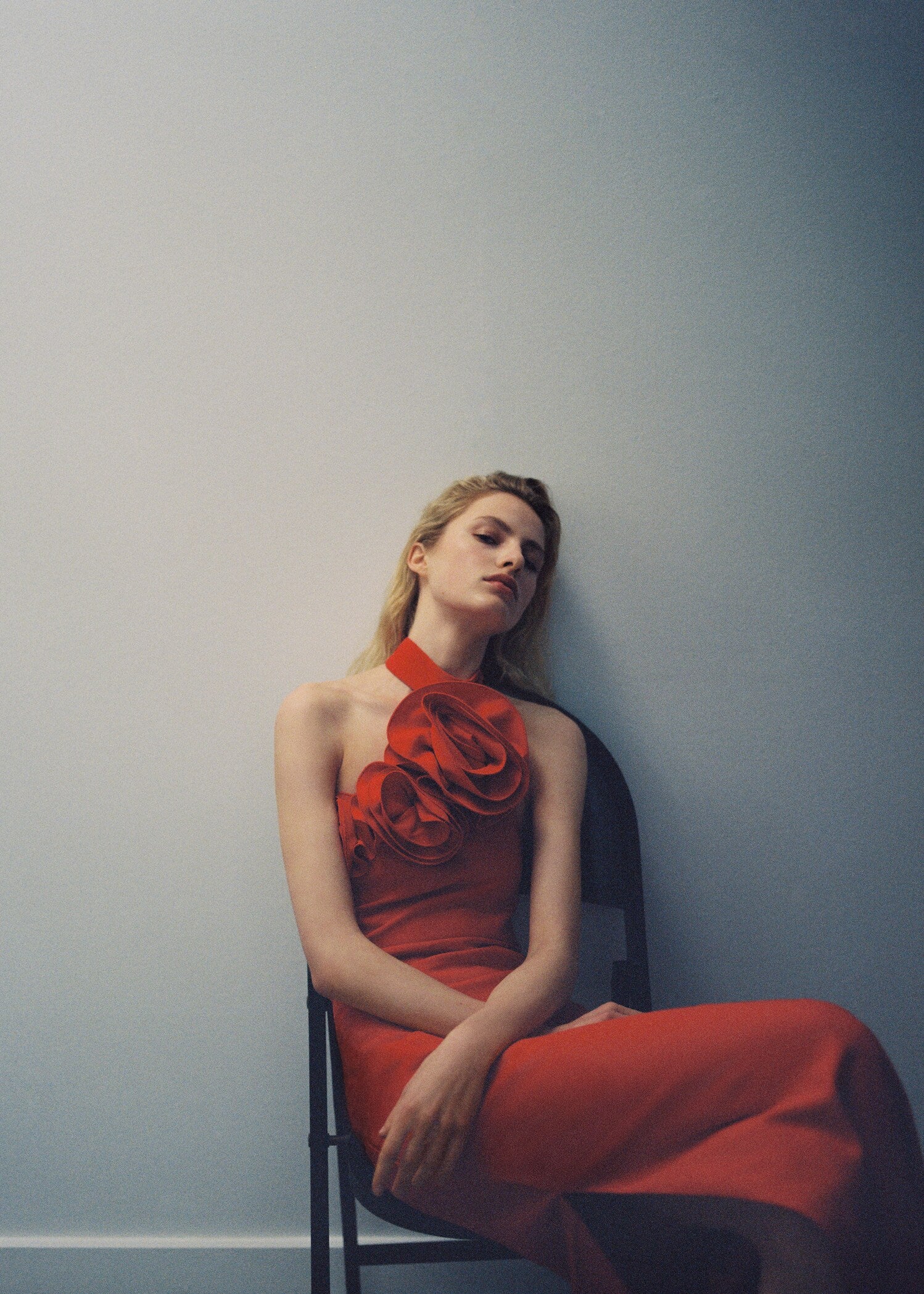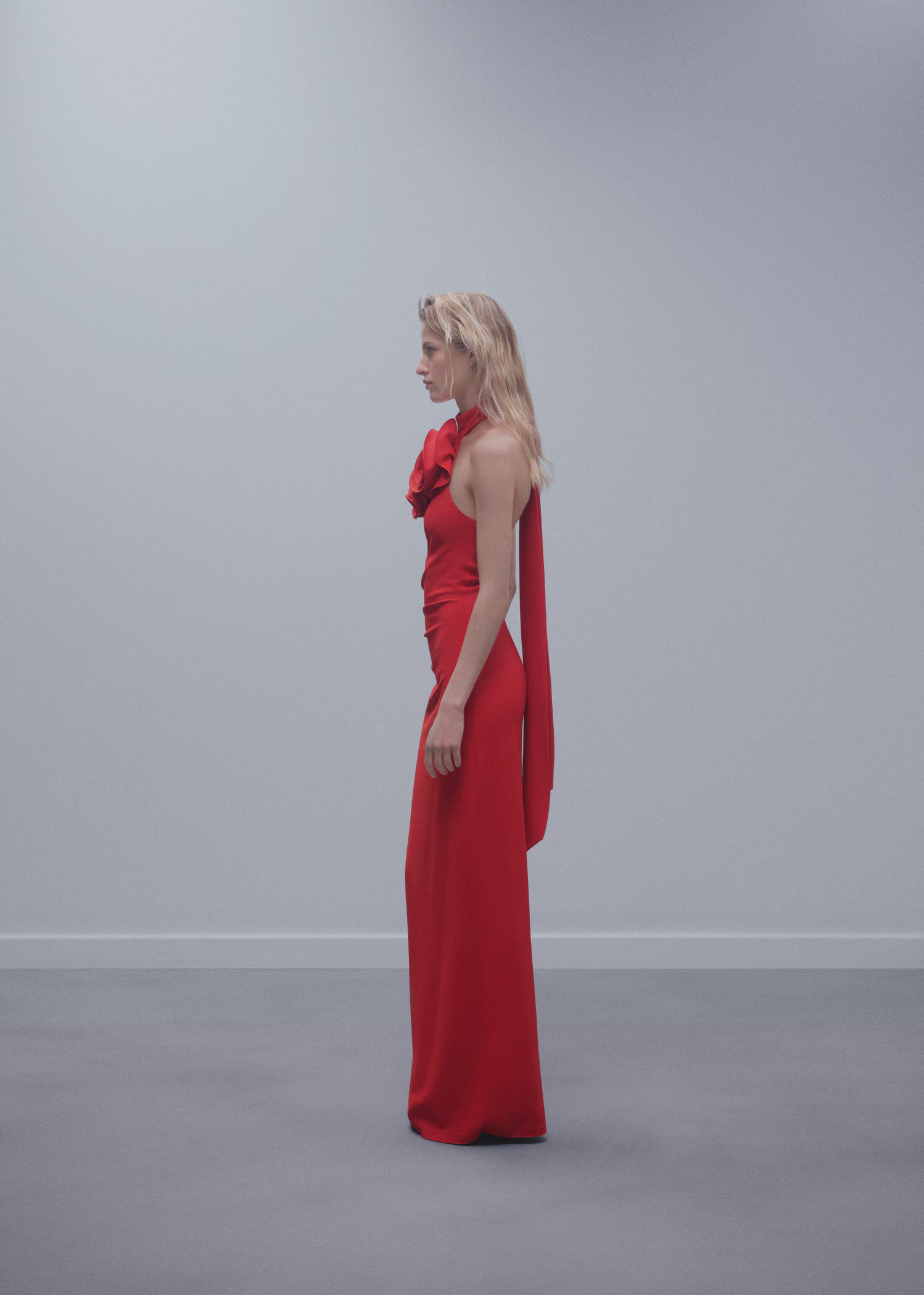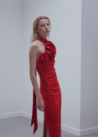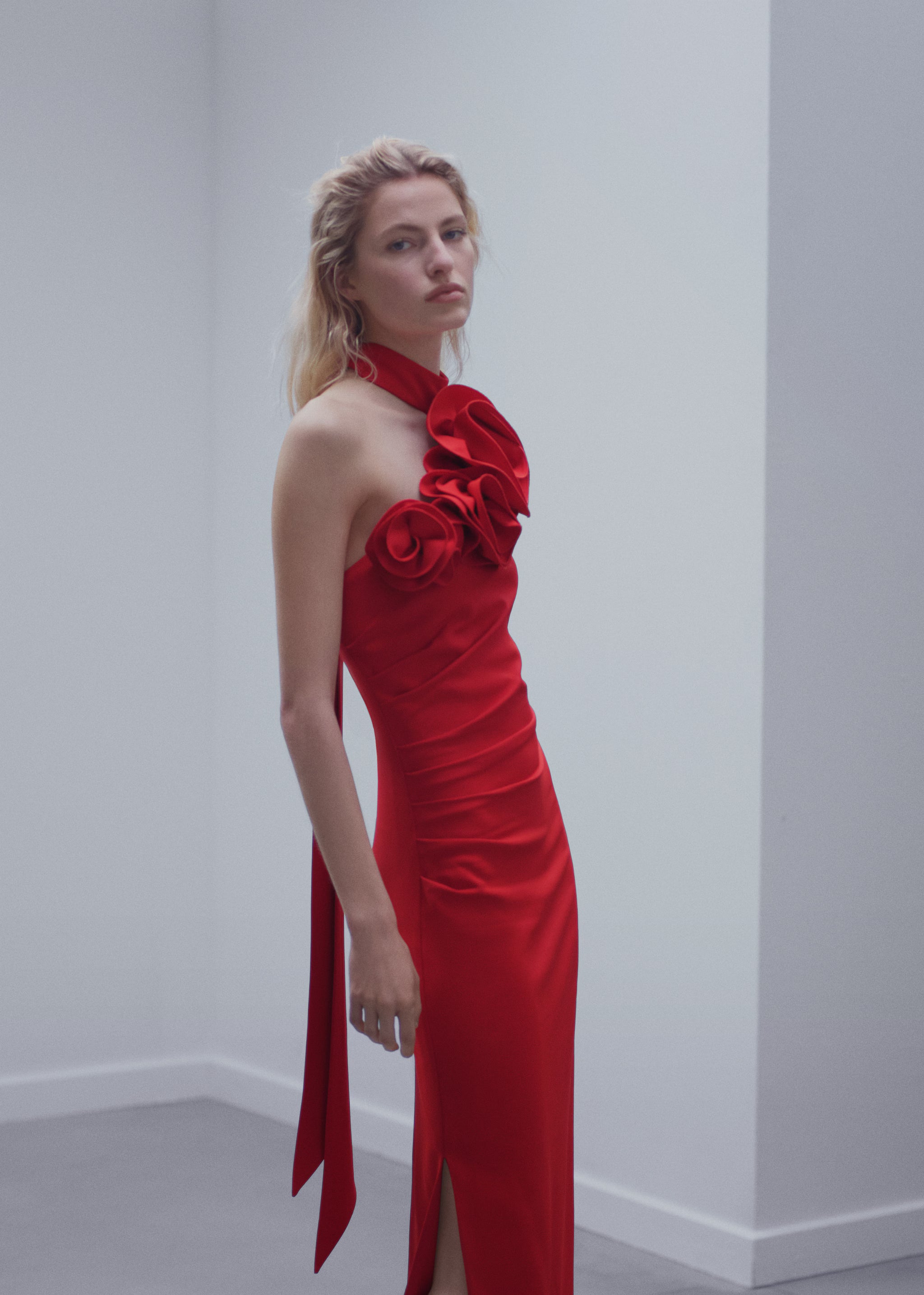 A striking red column with sculptural ease, this MNG Capsule maxi pairs a sleek, body-skimming silhouette with a dramatic oversized flower at the neckline. The halter tie and fluid skirt bring effortless glamour. Perfect for black-tie parties, galas, formal dinners, red-carpet moments, and any evening that calls for refined drama.