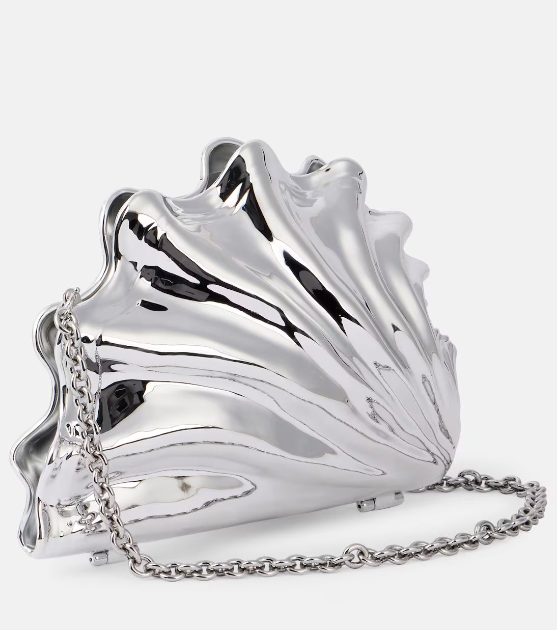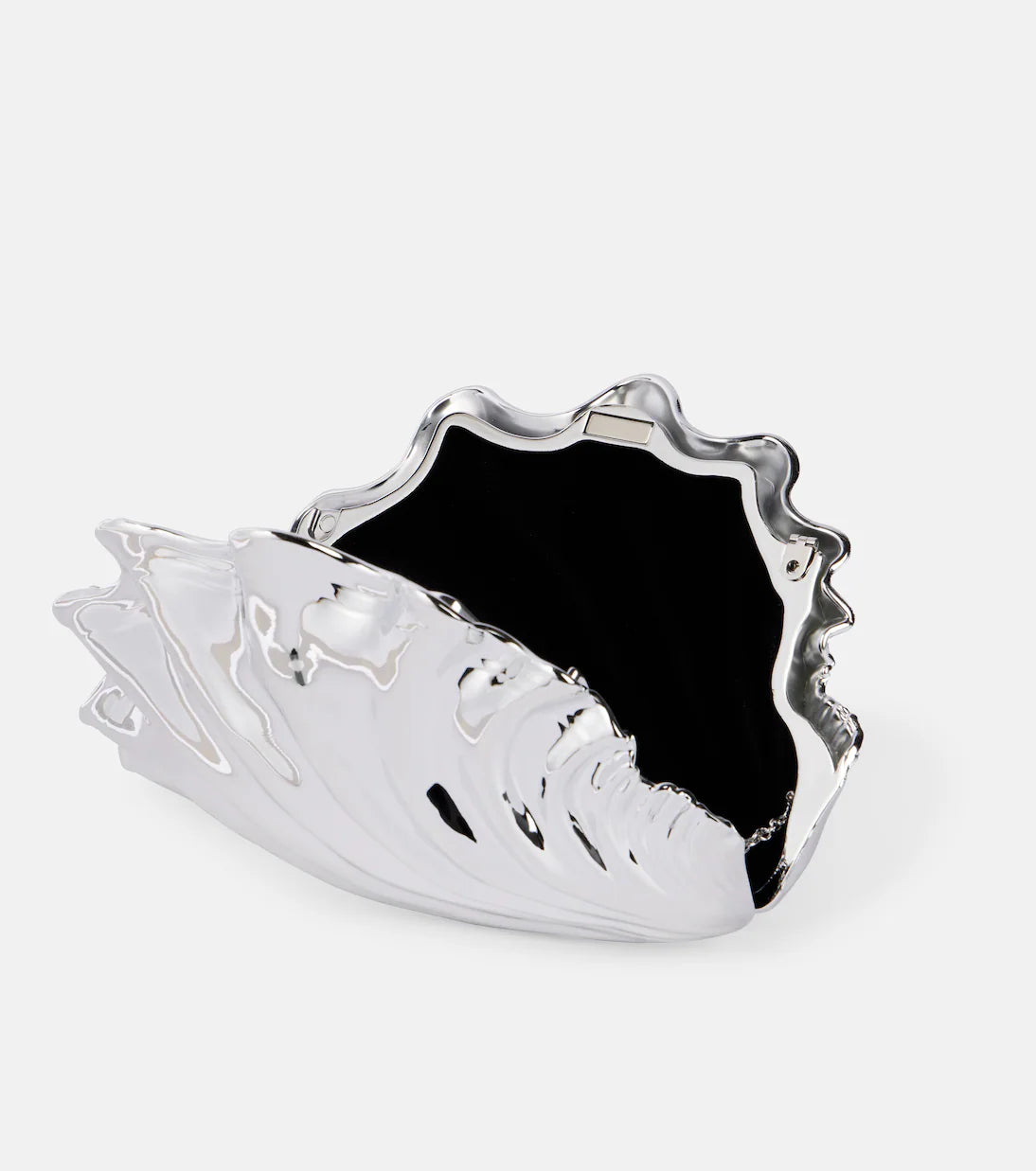 The Shell Mini Clutch by JW Anderson is a sculptural statement accessory inspired by organic shell forms. Crafted in a structured silhouette with a polished silver metallic finish, it features the brand’s signature curved design that reflects light beautifully. Complete with a secure top clasp closure, this clutch is perfect for cocktail parties, formal events, weddings, and elevated evening occasions.