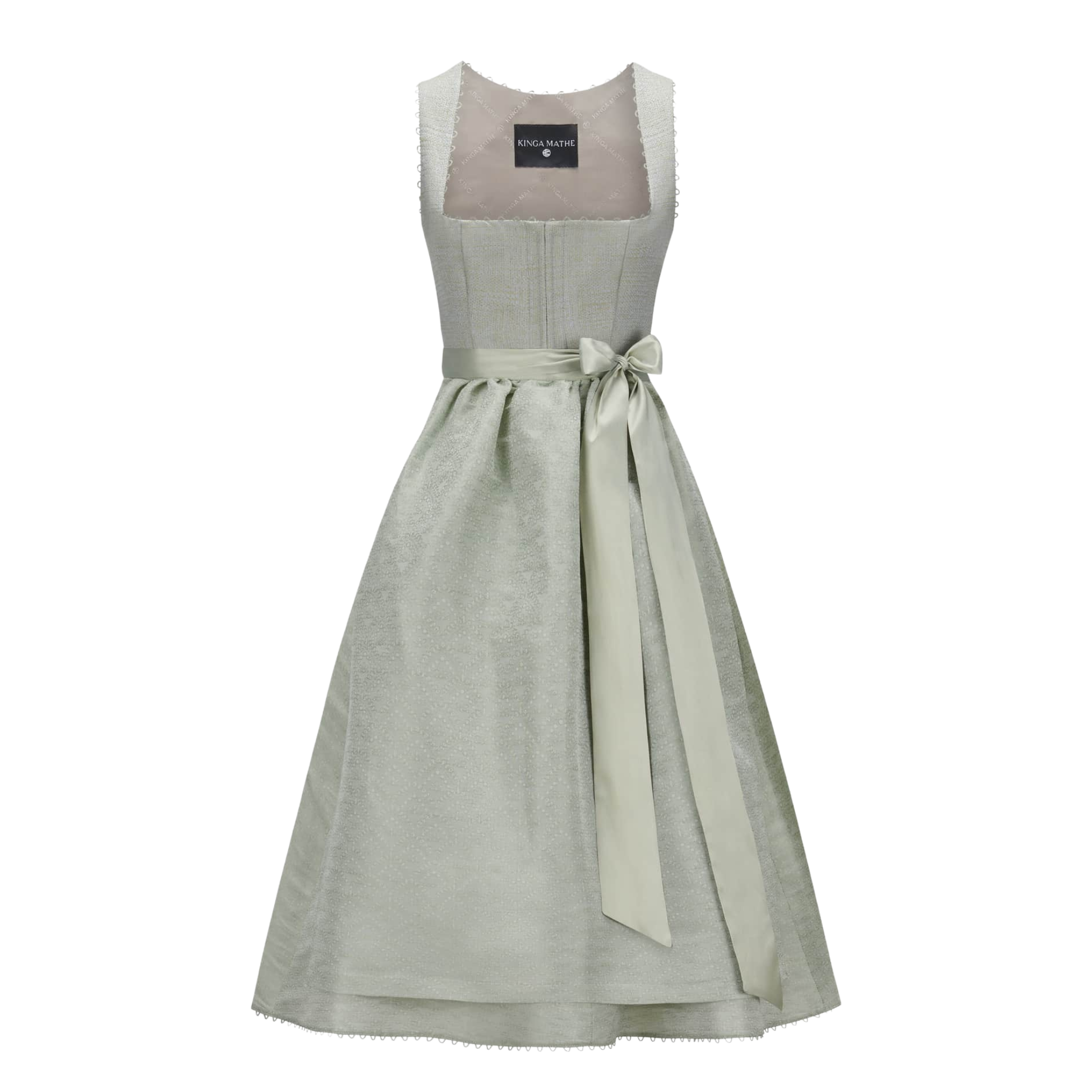 This Midi-Dirndl by Kinga Mathé in mint embodies refined elegance with a modern twist. Designed with meticulous attention to detail, this creation showcases a structured bodice adorned with delicate trims, while the volants hem of the underskirt adds a graceful, feminine silhouette. The tonal patterned apron in a lightweight linen blend completes the ensemble with harmonious charm. Crafted from exquisite fabrics and elevated through Kinga Mathé’s signature design approach, this dirndl captures the perfect balance between tradition and contemporary sophistication.