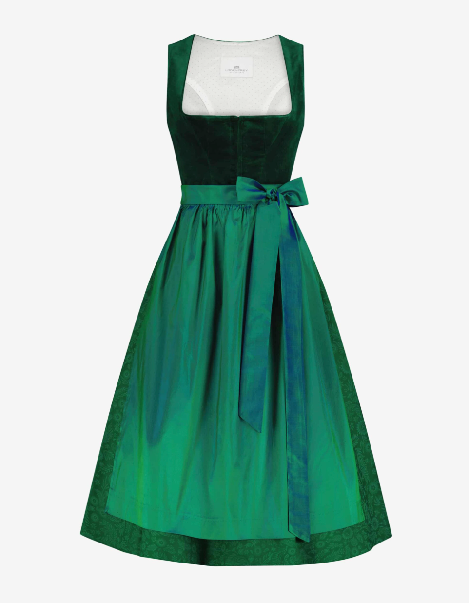 Step into sophistication with this dark green midi Wiesndirndl by LODENFREY, a refined expression of traditional craftsmanship and modern femininity. The tailored bodice, rendered in luxurious velvet, sculpts a flattering silhouette, while the softly lined skirt blooms with a delicate all-over floral pattern—evoking classic romance with every step. A shimmering, contrasting apron ties the ensemble together, adding depth and dimension to the overall look.