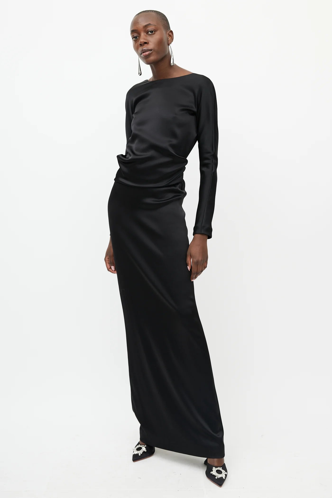 Timeless sophistication with a modern twist: This black satin Balenciaga gown features a clean round neckline, long sleeves, and a dramatic open back with an oversized bow. A subtle hem slit adds fluidity, while the full lining ensures a flawless drape.