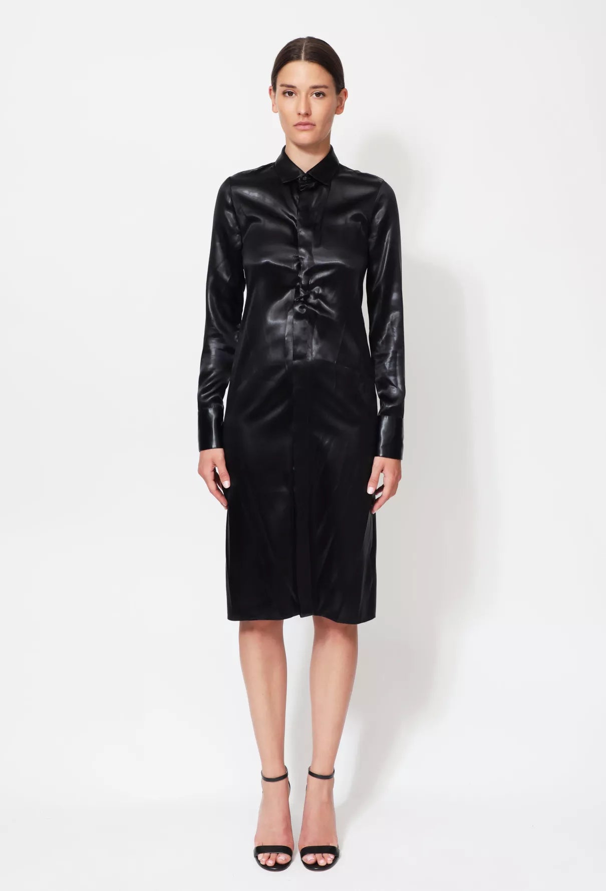 From Bottega Veneta’s Fall 2019 runway, this iridescent black satin shirt dress by Daniel Lee features a sculptural ruched open collar and fluid tailoring. Blending masculine structure with feminine sensuality, it’s a refined take on quiet confidence.