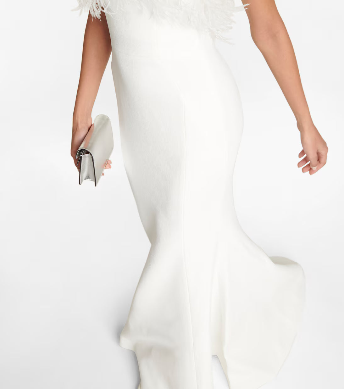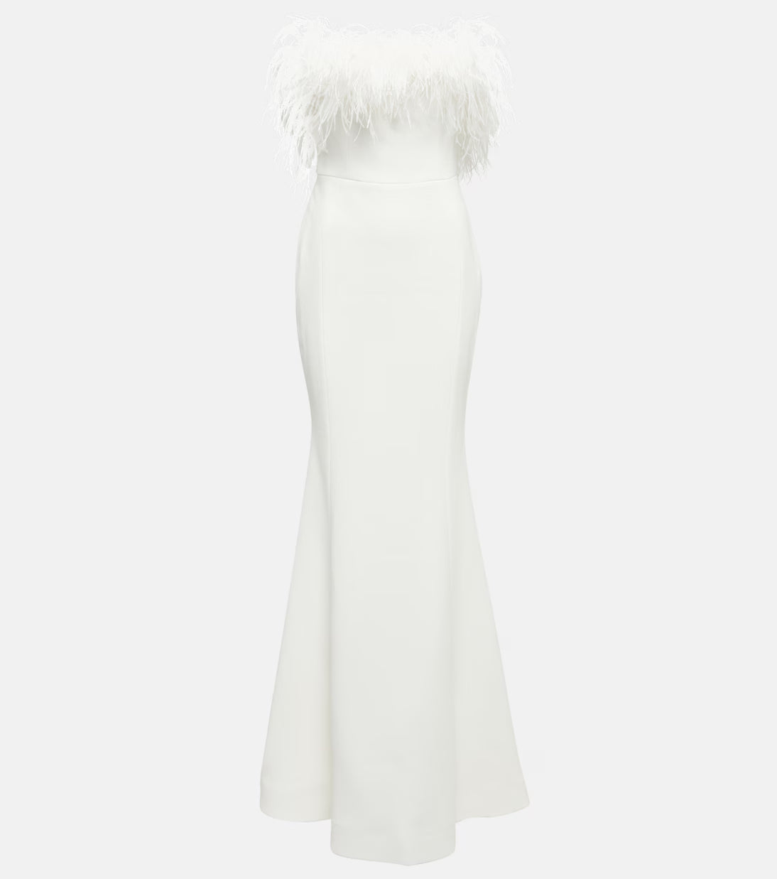 This strapless ivory gown by Rebecca Vallance embodies effortless elegance and timeless romance. The flared skirt flows gracefully with every step, while the ostrich feather neckline adds a touch of couture drama, soft, feminine, and undeniably chic. Perfect for the modern bride who believes less is more, yet still loves a little magic.