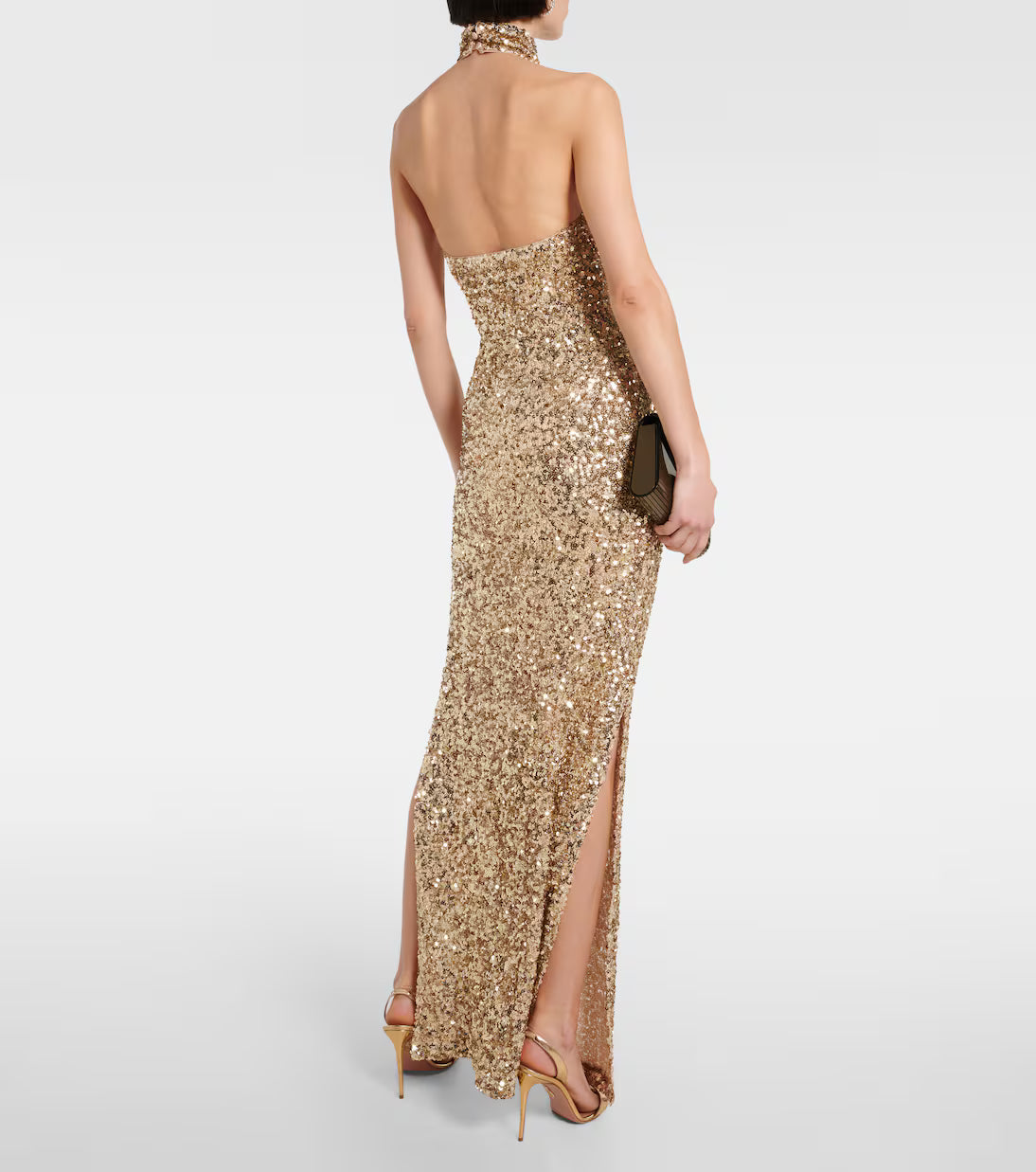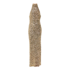 Shine bright in the glamorous creations of Rotate. This gold sequined dress features a sophisticated halter neckline, perfectly blending elegance with a bold, statement-making sparkle.