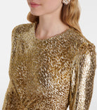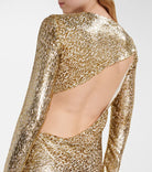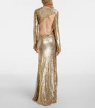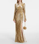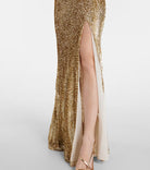 Shine with understated glamour in this gold fil coupé maxi dress by Self-Portrait. Crafted in delicately textured fabric with a flowing silhouette, it drapes elegantly while catching the light with every movement. Modern yet timeless, this gown exudes refined sophistication with a hint of playful sparkle.