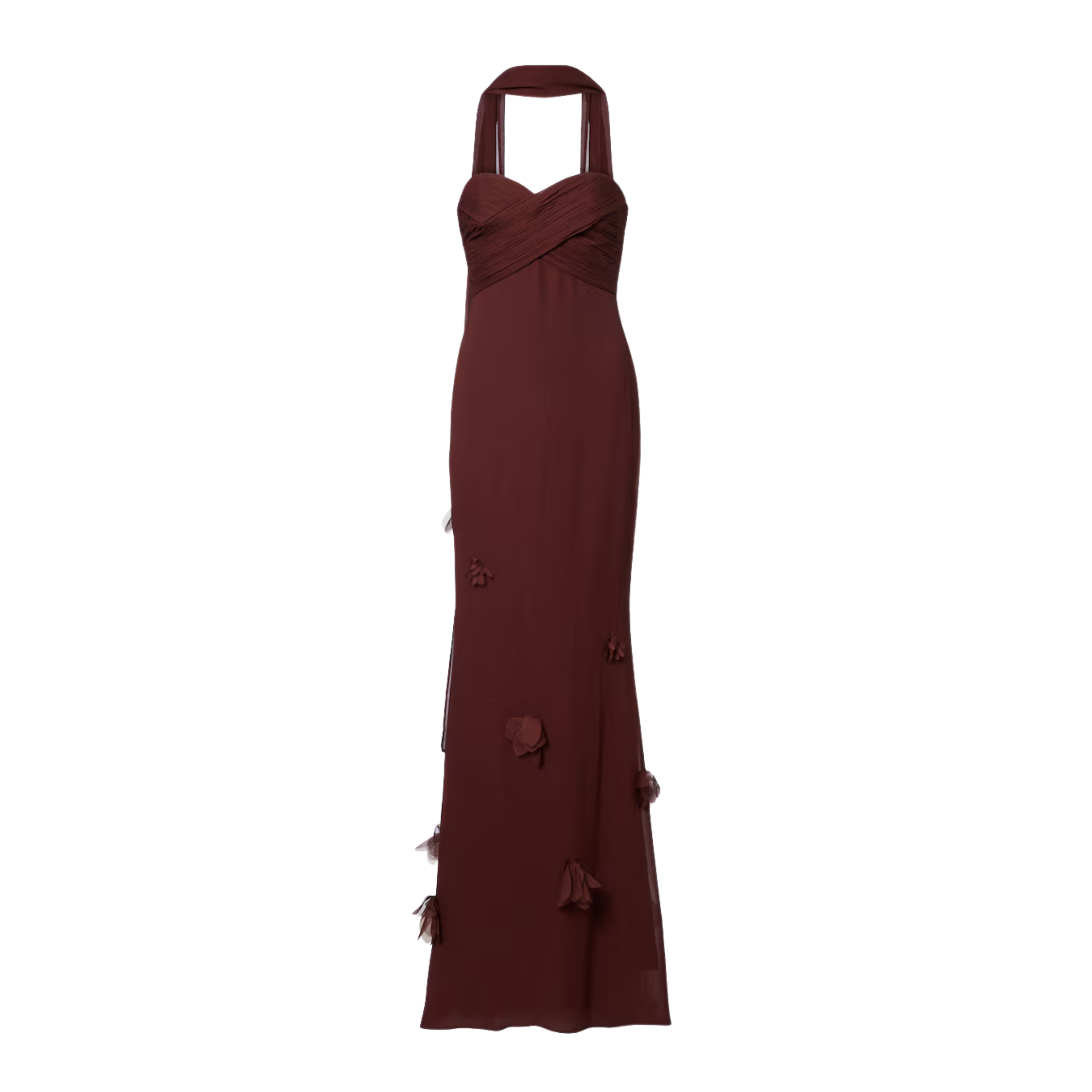 With each of its feminine designs, the popular brand Self-Portrait pursues the goal of empowering women. This red robe presents itself in a strapless silhouette with elaborate floral applications and a scarf detail that can be elegantly draped along the back.