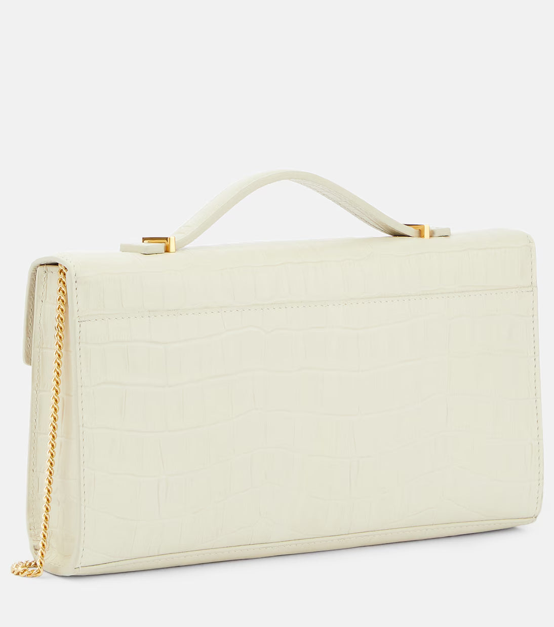 The Vancouver Leather Clutch by Demellier is a refined and structured accessory designed for polished occasion styling. Crafted in white embossed leather with a subtle crocodile texture, it features a sleek envelope silhouette and a statement gold-tone bar clasp. Finished with a structured top handle, this clutch is perfect for weddings, bridal events, cocktail parties, and elegant formal occasions.
