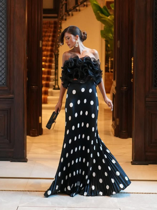 A modern play on evening glamour, this two-piece set pairs L’Idée’s sculptural black ruffle top with a pleated, floor-length polka-dot skirt. The contrast feels bold yet effortless. Perfect for weddings, black-tie events, cocktail nights, and any occasion that calls for drama without trying too hard.