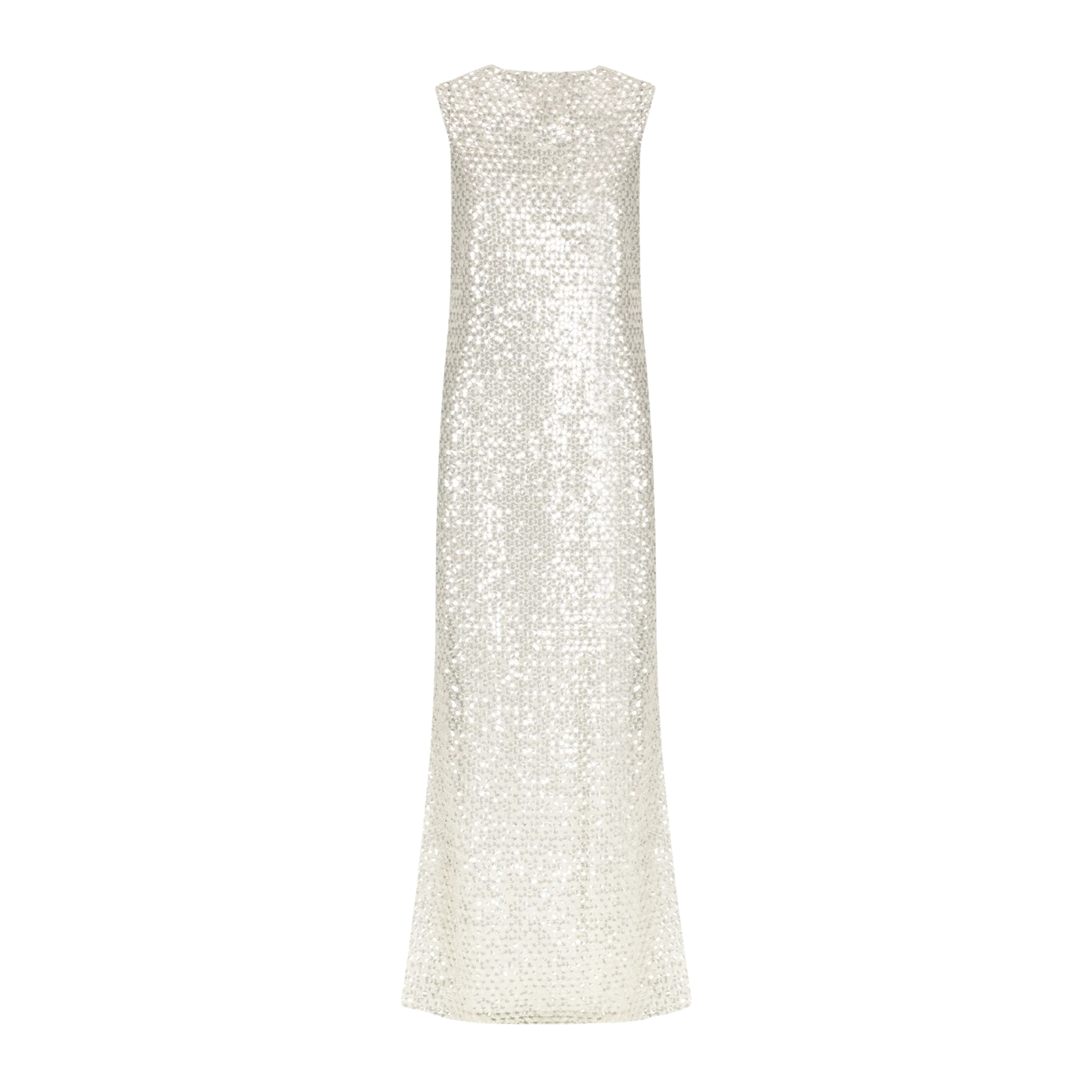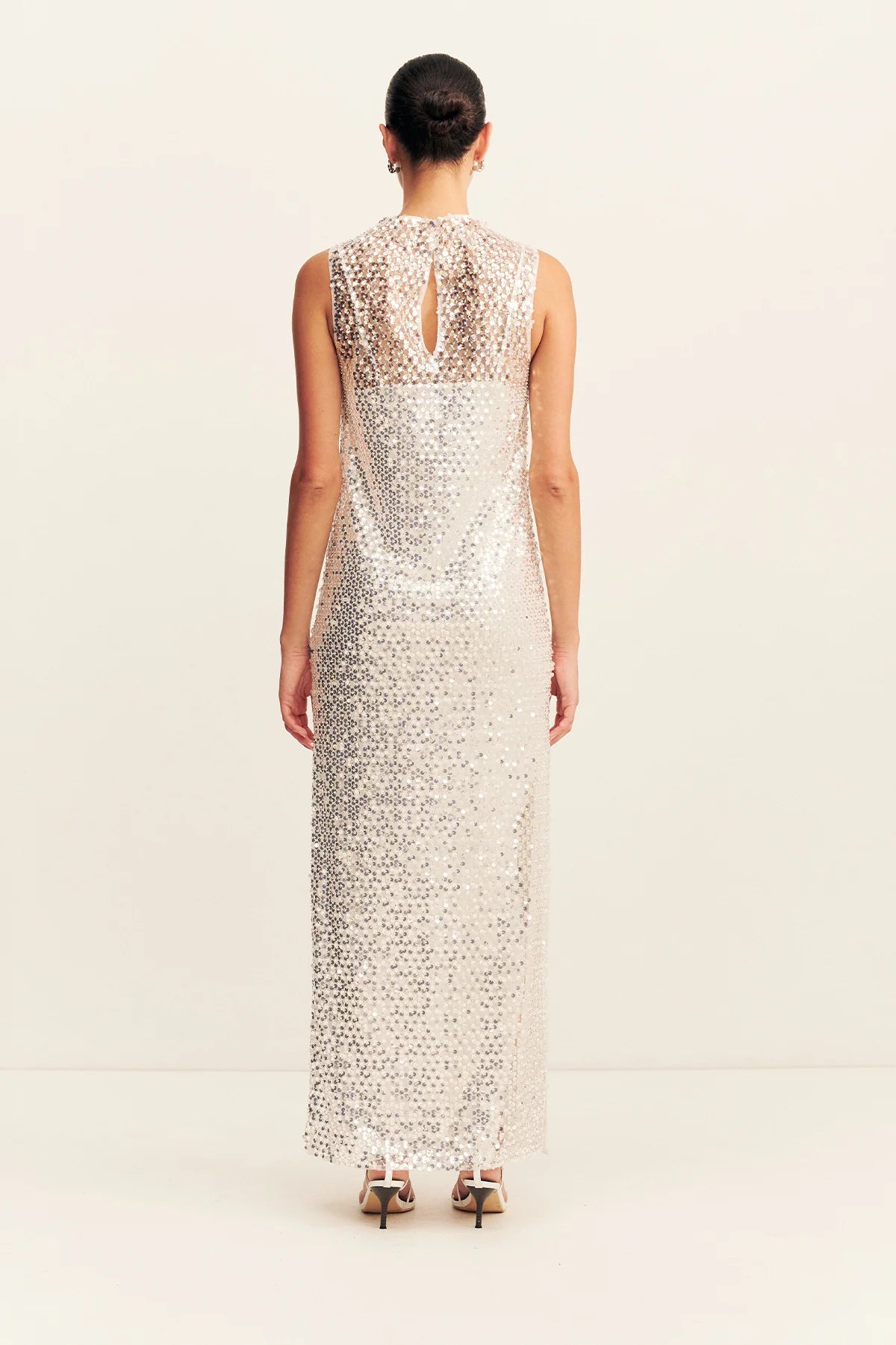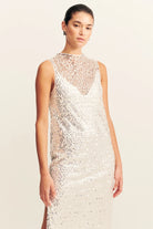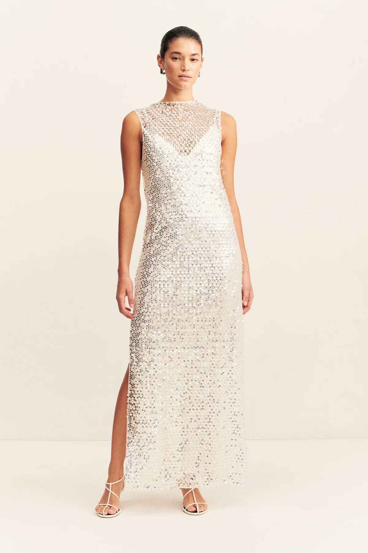 A luminous, high-neck column drenched in sequins, this sheer Shona Joy maxi brings a modern, statuesque elegance. Crafted from embellished mesh (does not include an underlay), it offers a bold, ethereal reveal—perfect for brides, black-tie events, formal parties, milestone birthdays, and after-dark celebrations.