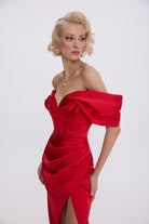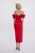 Elegant with a touch of drama, the Laura Dress by Gigii’s is a striking red off-shoulder midi gown designed to command attention. The structured bodice is accented with sculptural puff sleeves that frame the neckline beautifully, while the fitted skirt and subtle front slit create a sleek, feminine silhouette. Confident, romantic, and timeless, it’s an unforgettable choice for special occasions where classic glamour meets modern refinement.
