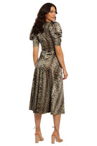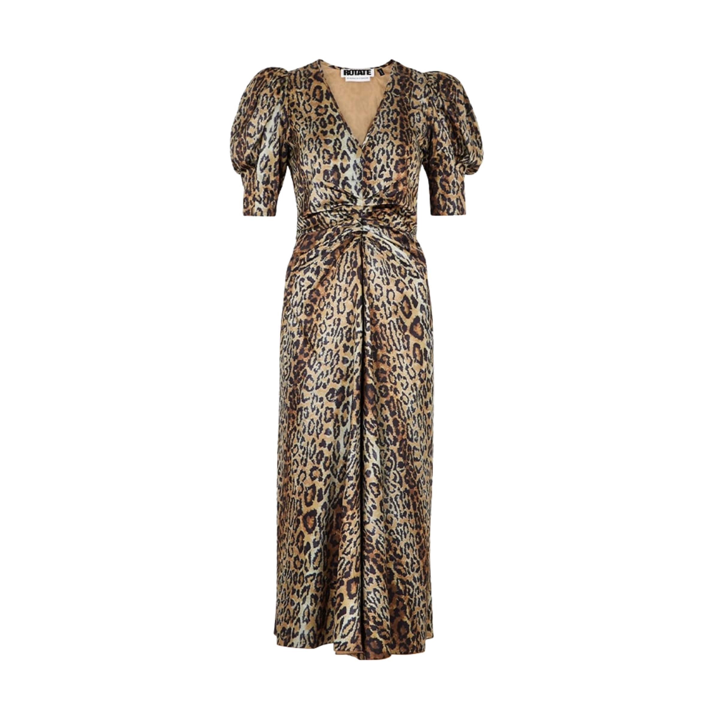 Bold yet beautifully wearable, this leopard-print midi brings effortless glamour with its ruched waist, fluid drape, and softly structured sleeves. The V-neckline adds a flattering hint of drama — perfect for birthdays, dinner parties, cocktail nights, or any celebration that calls for a confident, standout look.