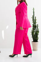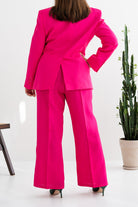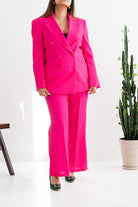 Blazer with darts at the waist, long sleeves, double-breasted button placket, a high lapel collar and flap pockets.