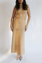 A sculptural Christopher Esber midi dress that perfectly captures the designer’s signature approach to modern minimalism. Crafted in a soft nude ribbed knit, this sleeveless silhouette features Esber’s iconic architectural cutouts at the waist, creating a fluid, contoured effect that feels both sensual and refined. The midi length balances the bold detailing, making it striking yet wearable.