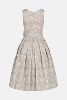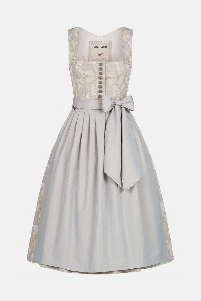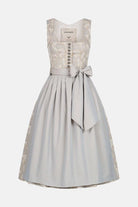 The classic cut in combination with high-quality jacquard fabric makes up our Hedi "Folklore Greige" model with an elaborate floral pattern. The matte, color-coordinated apron completes the overall picture. The varied pattern print together with the traditional, elaborately embossed buttons give the dirndl a charming vintage look. The apron is perfectly coordinated with the midi dirndl.