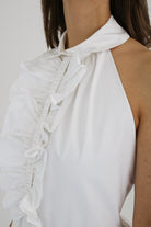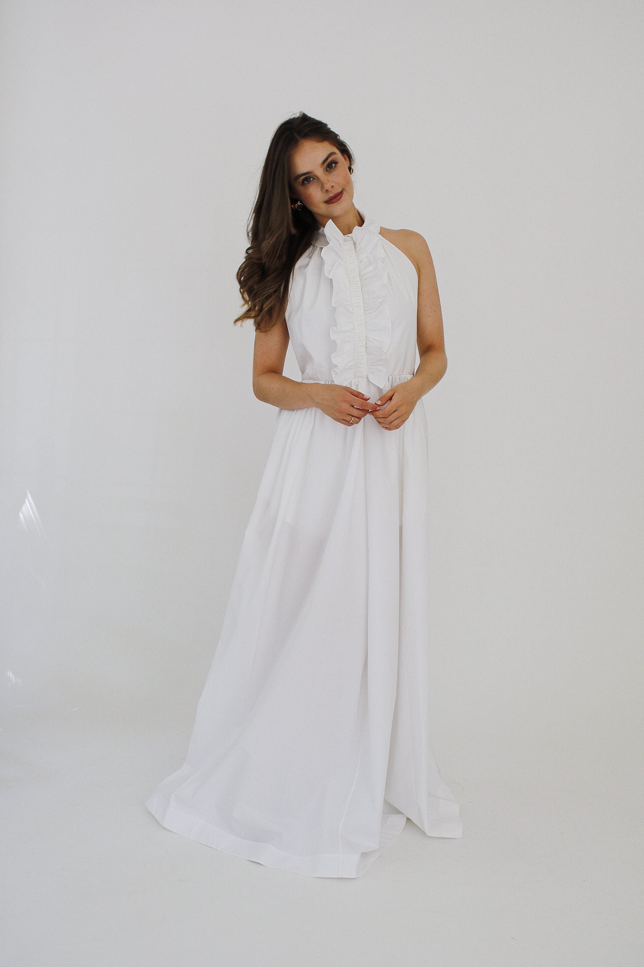 This sleeveless Dice Kayek gown pairs refined elegance with a playful twist. Featuring a ruffled placket, Peter Pan collar, gathered waist, and floor-sweeping hem, it's finished with side split pockets and a concealed front closure.