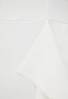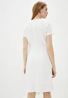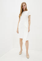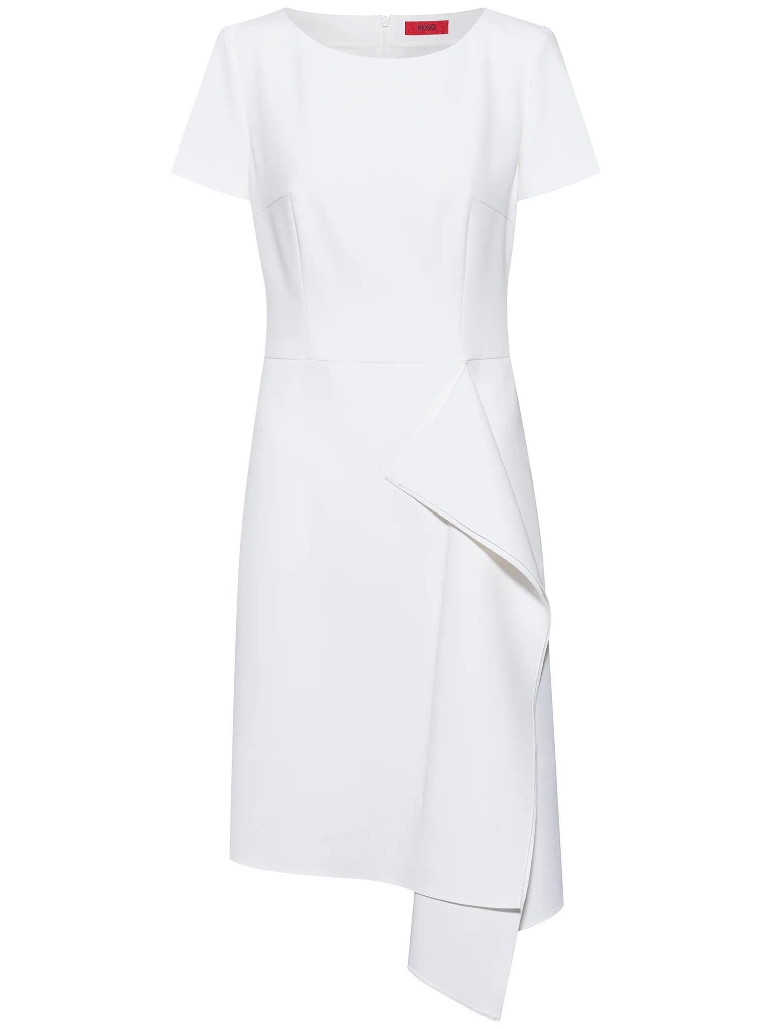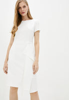 Elegant and modern, this tailored white dress features a sleek silhouette, boat neckline, and structured short sleeves. The asymmetric draped detail adds a contemporary edge, perfect for business meetings and formal occasions. Crafted from premium fabric for all-day comfort.