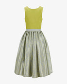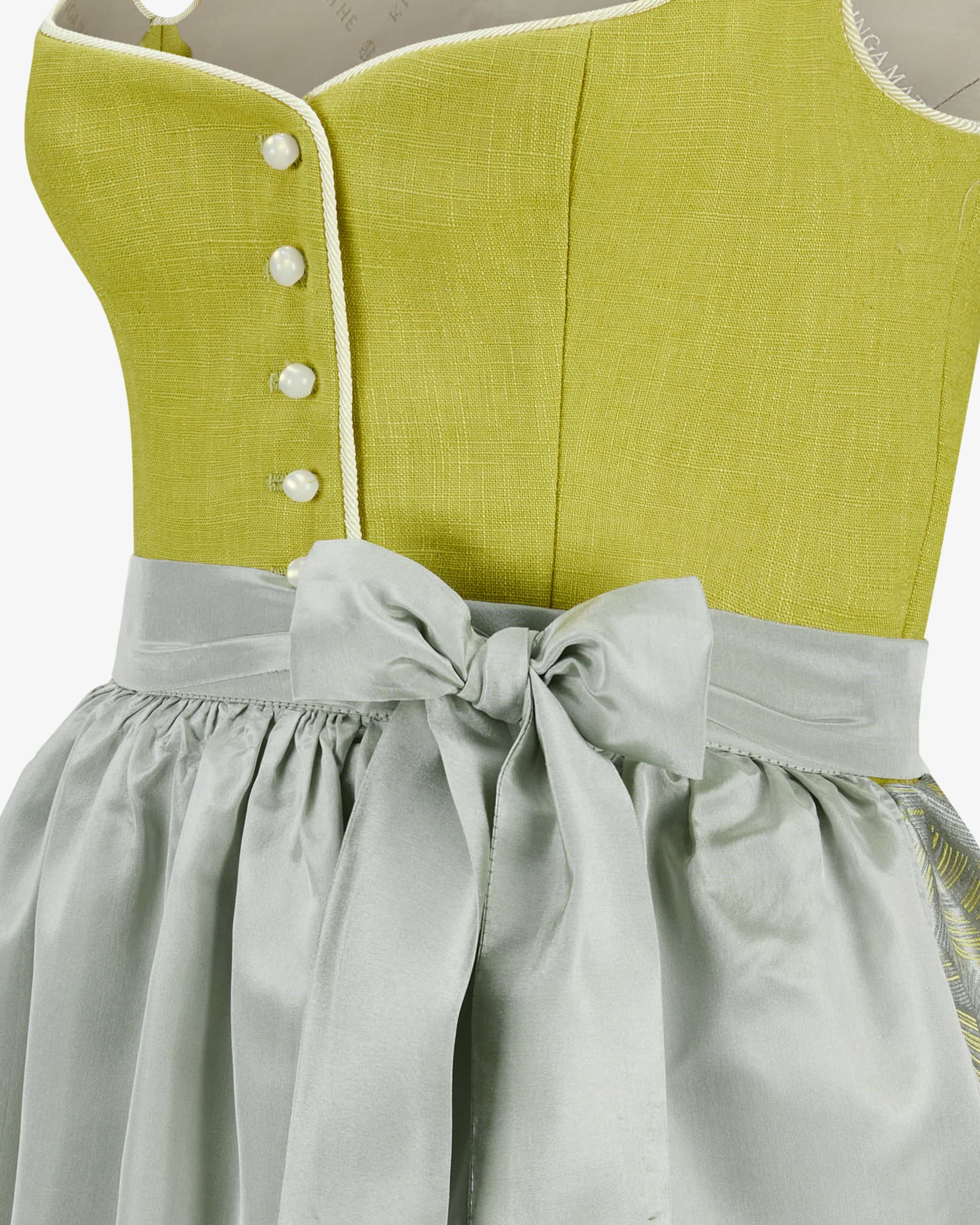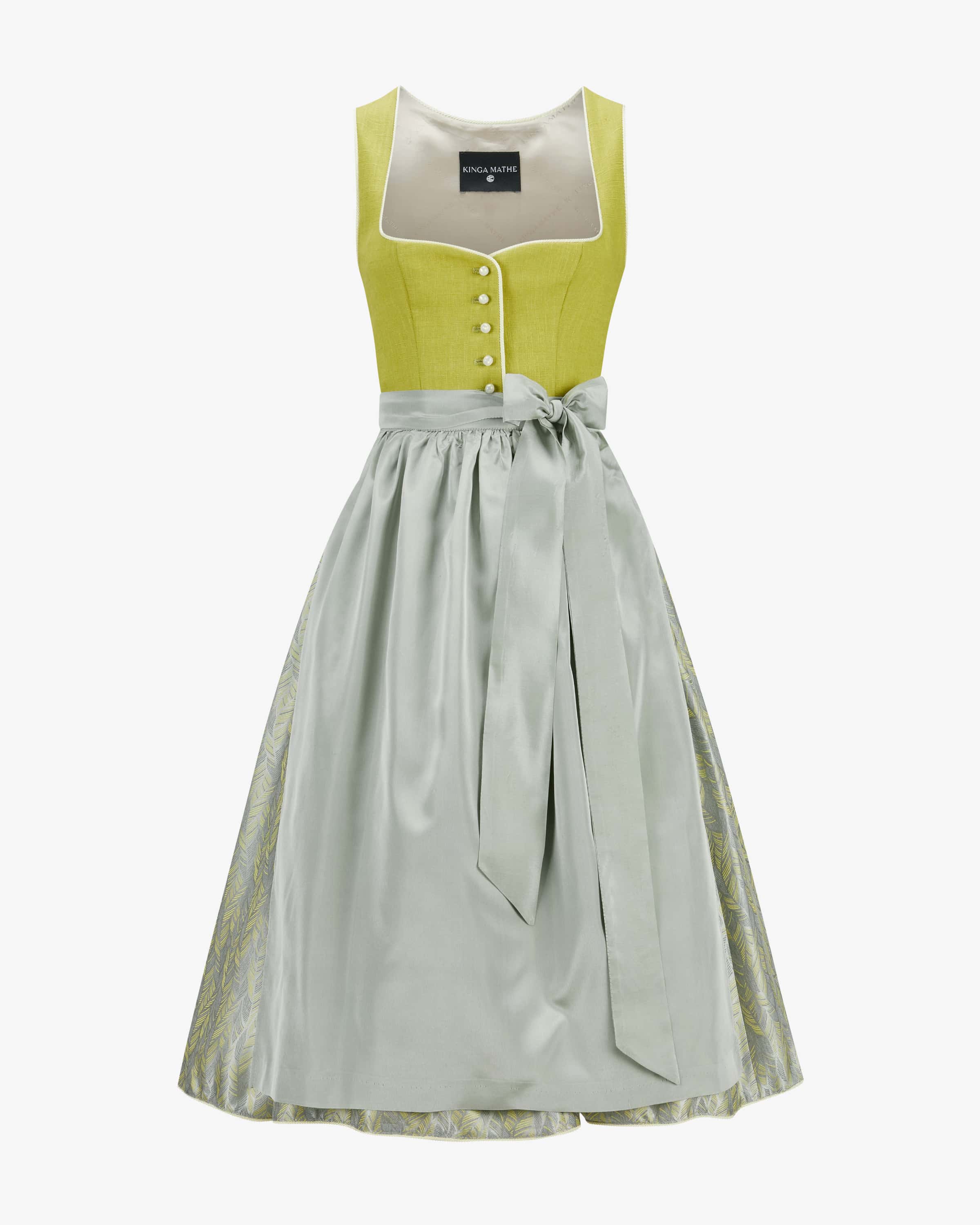 Lech midi dirndl with silk apron for women by Kinga Mathe in green and light grey. With attention to detail, the German label designs elaborate traditional costume creations with that certain something and convinces traditional costume lovers with exquisite fabric selection and creative designs. The model impresses with its linen bodice and is stylishly complemented by cord piping and sophisticated ball buttons. At the same time, the modern patterned skirt skilfully sets the design in scene, while the elegant silk apron harmoniously completes the traditional costume look.
