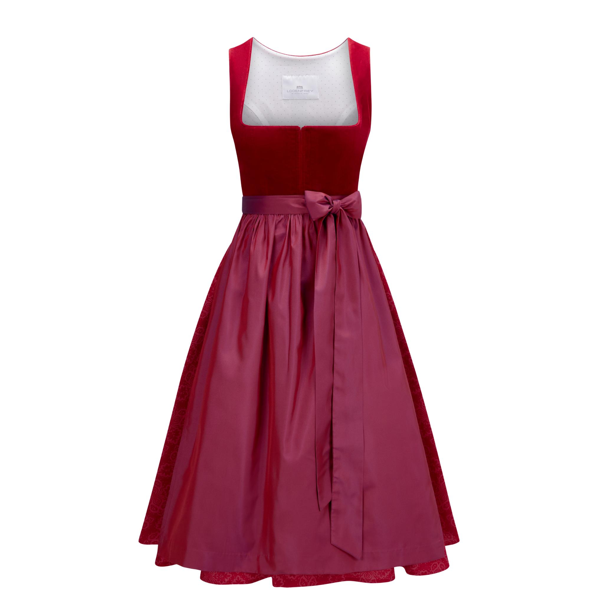 The Midi-Wiesndirndl by LODENFREY in rich red is the epitome of timeless elegance and Bavarian tradition. Crafted with decades of expertise and an eye for the finest details, this piece radiates sophistication. The bodice, designed in a luxurious velvet look, creates a striking silhouette, while the lined skirt with delicate floral ornaments adds graceful movement. A versatile apron enhances the ensemble, giving you styling freedom for different occasions. The refined heart embroidery on the back of the bodice is a subtle yet charming detail that makes this dirndl truly unique.