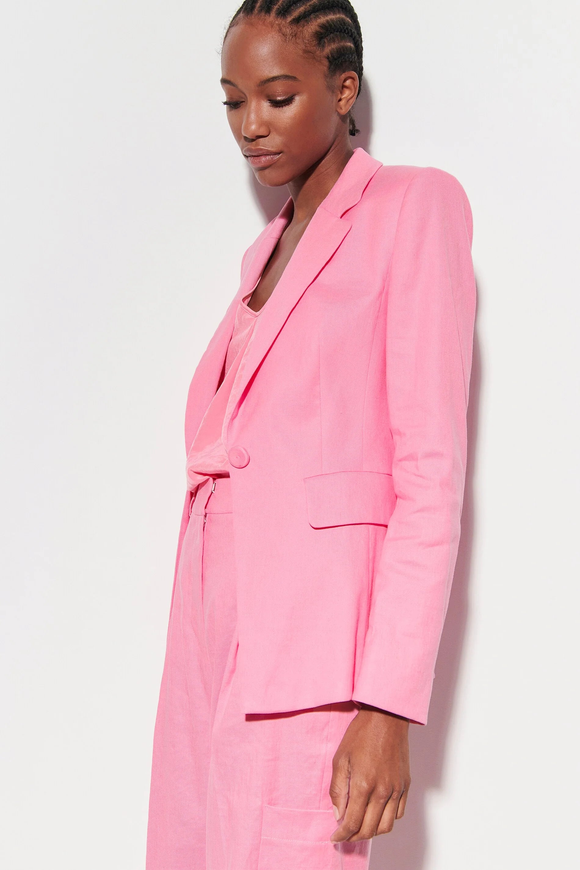 This Luisa Cerano tailored blazer delivers effortless polish in a soft pink hue with a clean, modern cut. Lightly structured with sharp lapels and an easy drape, it’s perfect for work events, cocktail parties, dinners, fashion events, and elevated daytime occasions where refined colour makes the statement.