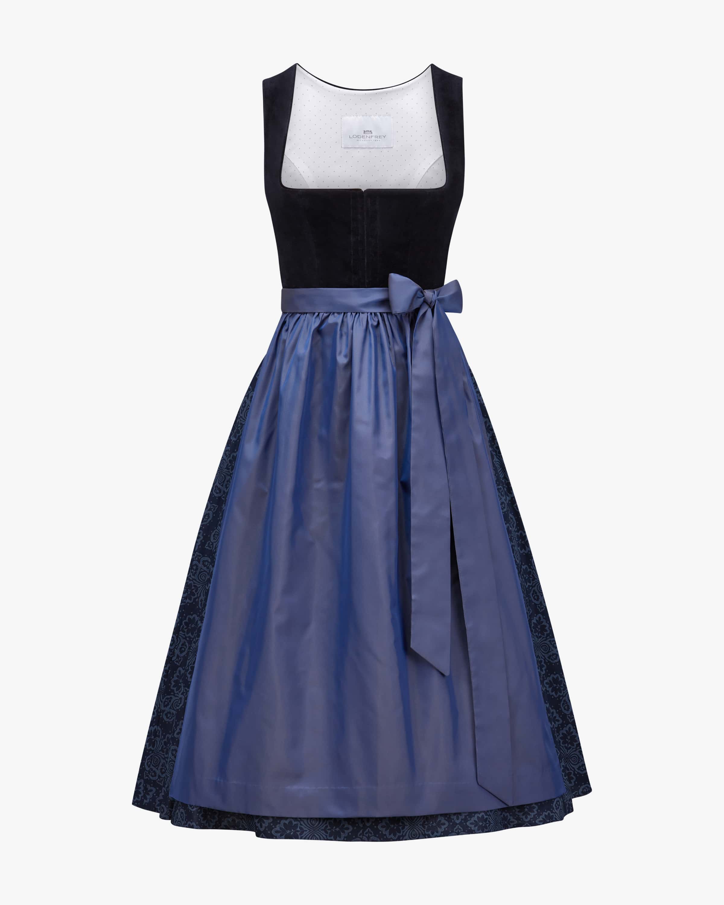 Midi Oktoberfest dirndl with apron for women by LODENFREY in light blue. Years of experience, high-quality workmanship and great attention to detail characterize these exclusive creations. The bodice in a classy velvet look is stylishly complemented by the rowed skirt with the floral ornament pattern, while the shimmering apron skilfully completes the high-quality overall picture. At the same time, a sophisticated heart embroidery on the back of the bodice gives your traditional look that certain something.