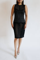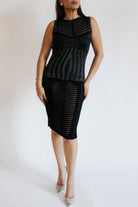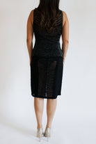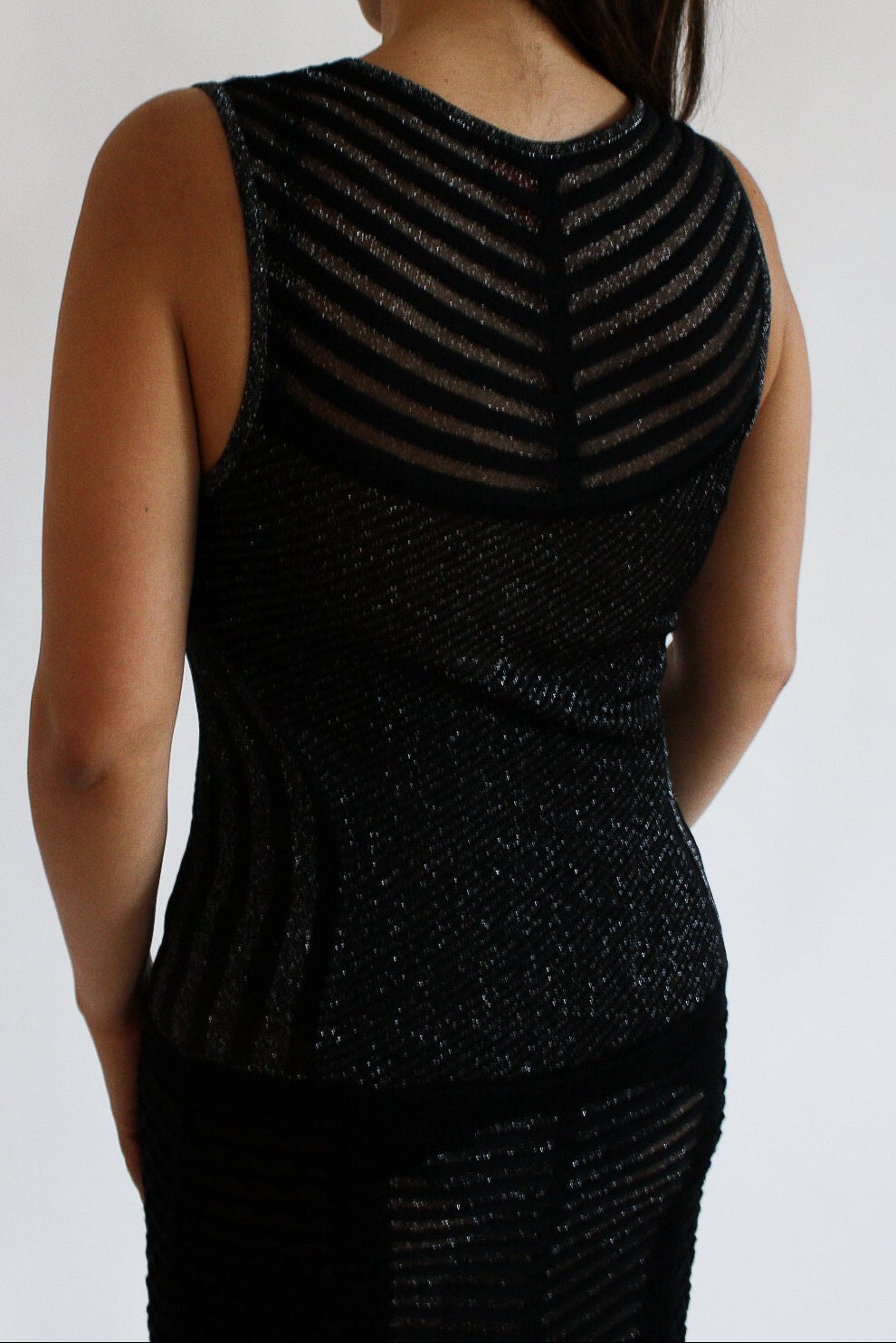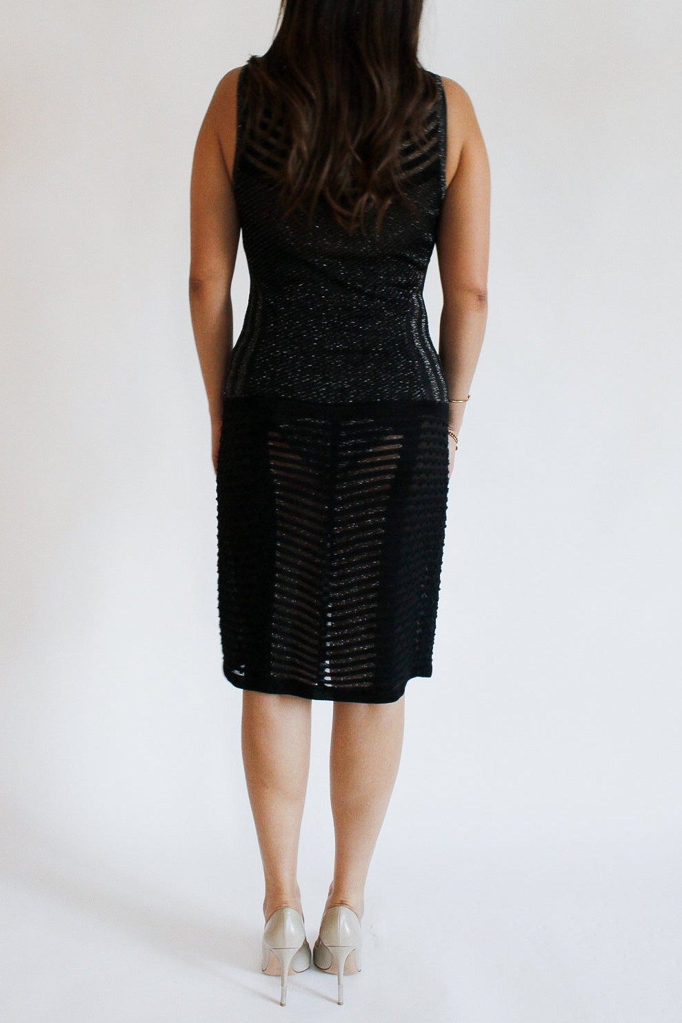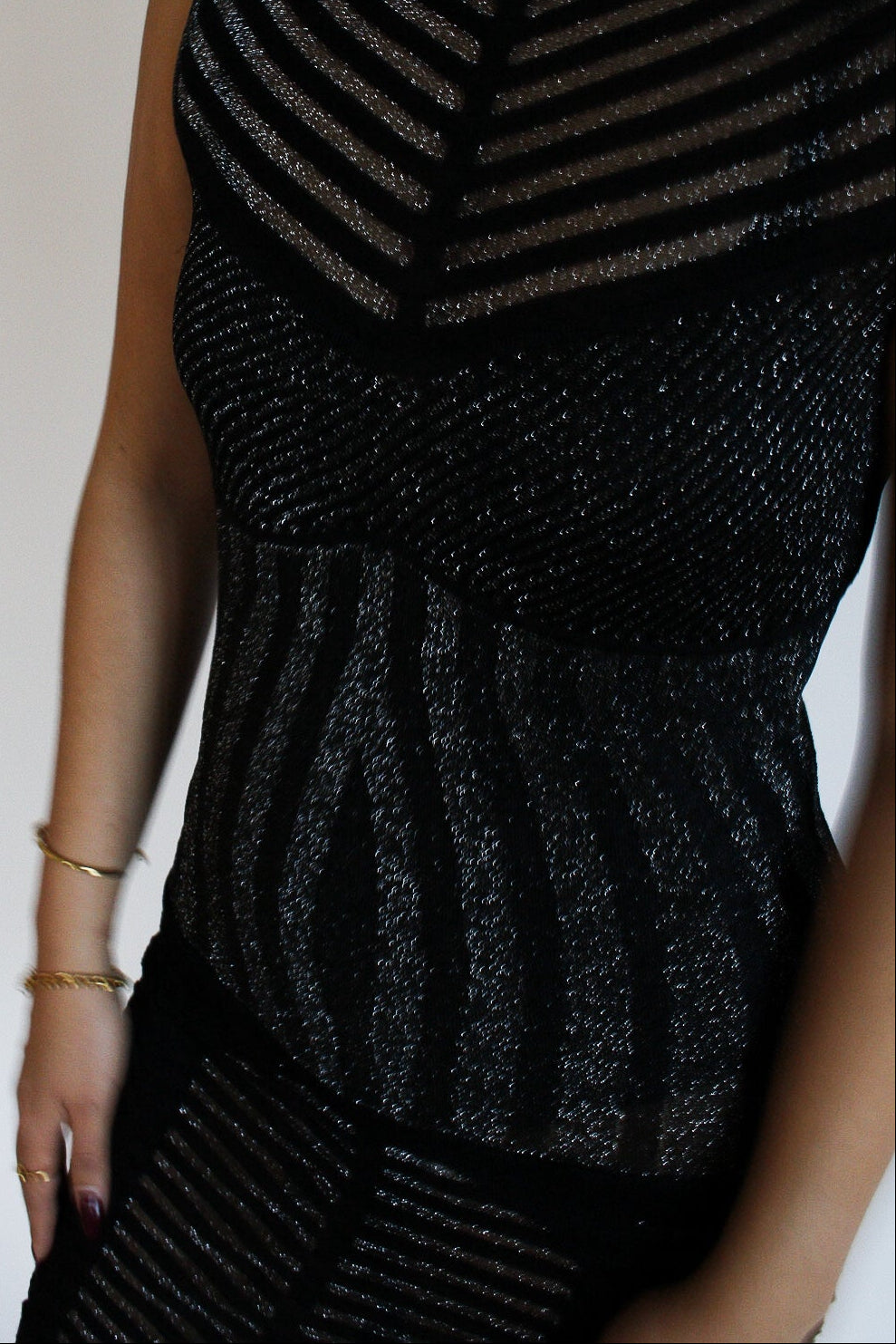 This Missoni sheer black dress brings understated drama with its signature knit and subtle shimmer. The sleeveless silhouette skims the body, while graphic stripes and semi-sheer panels add texture and movement. Perfect for cocktail parties, evening events, date nights, birthdays, and stylish dinners when you want something sleek yet quietly striking.