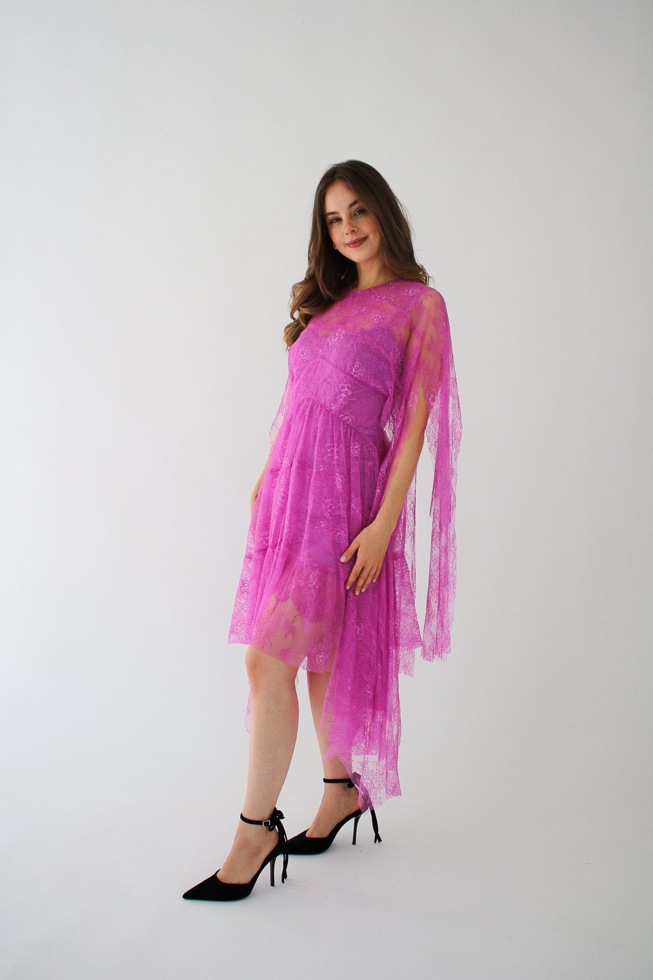 A bold yet romantic fuchsia lace dress, made to turn heads. With its sheer overlay, asymmetric drape, and elegant silhouette, it’s perfect for weddings, garden parties, or elegant summer evenings.