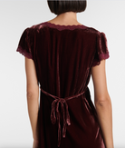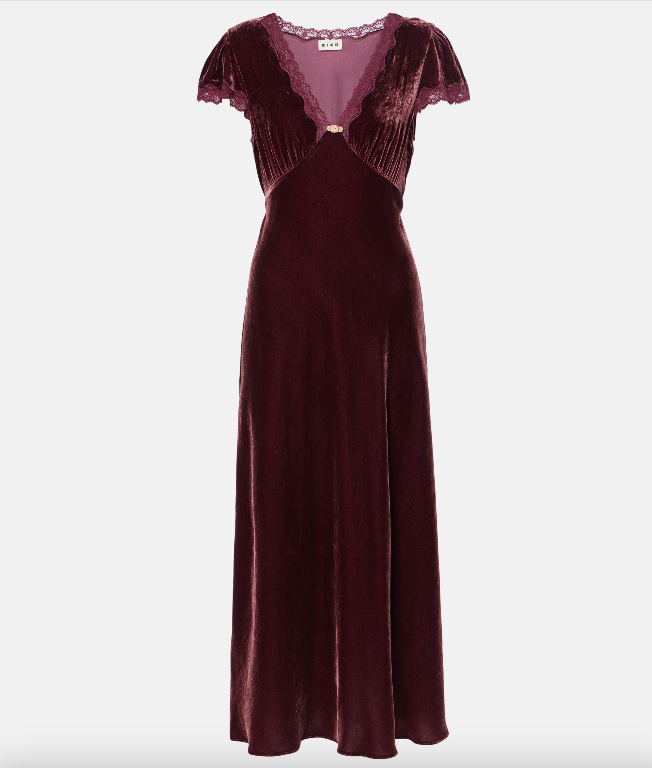A party-wear must-have, discover the RIXO Clarice dress. This luxurious midi dress is crafted from soft velvet fabric and showcases RIXO's beloved bias cut, offering the most flattering fit. It has a V neckline, empire waist, adjustable tie at the waist and cap sleeves with lace trims. A small rose on the neckline finishes the design, adding a vintage feel.