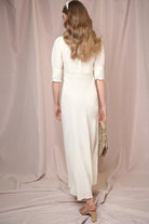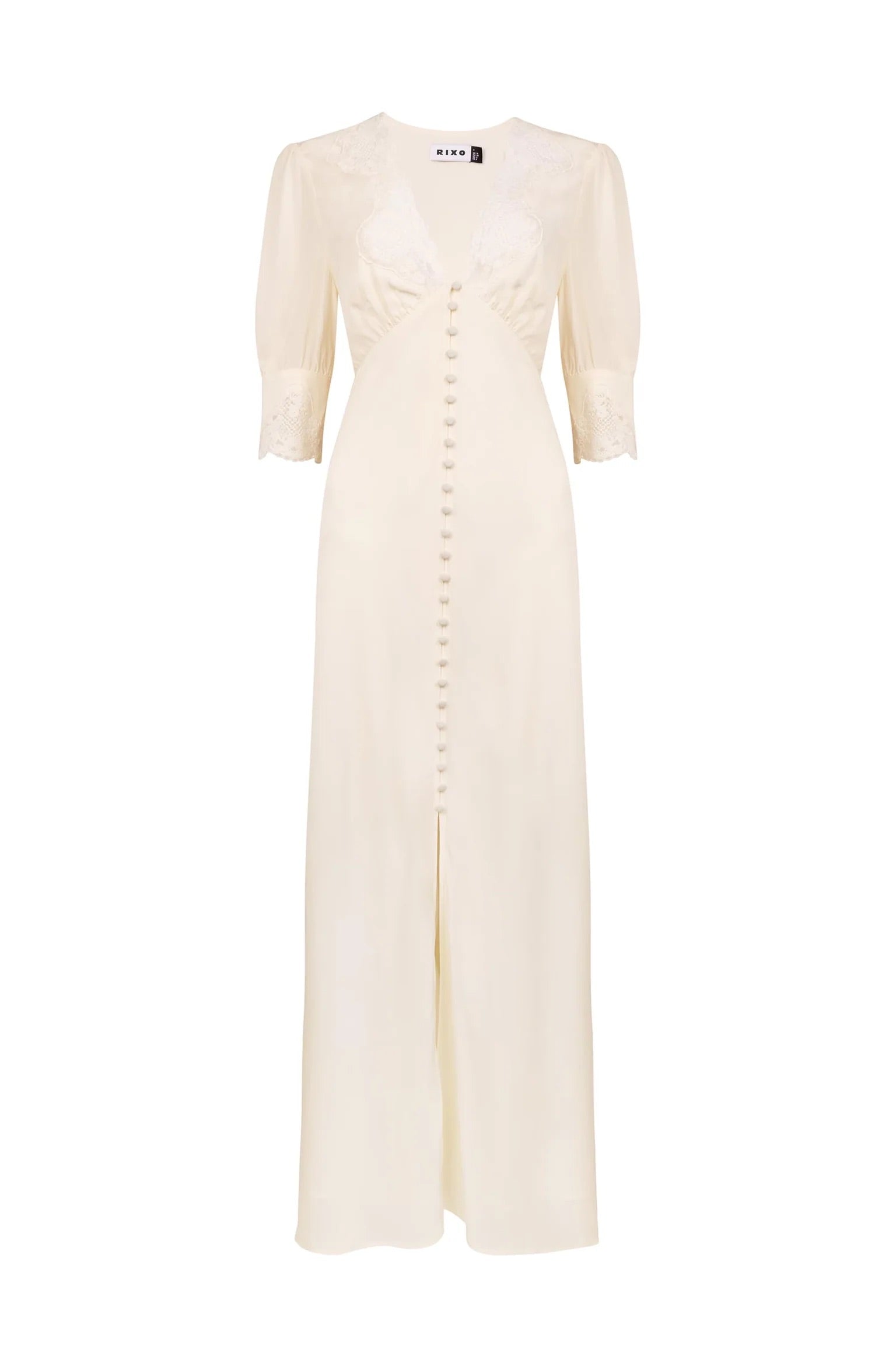 The Simone is an iconic RIXO dress. Her ivory bridal style is cut on the bias from luxurious satin-back crepe, so hangs loosely along the body’s lines and falls fluidly. She is trimmed with antique-style lace at her sleeve trims and V-neckline.