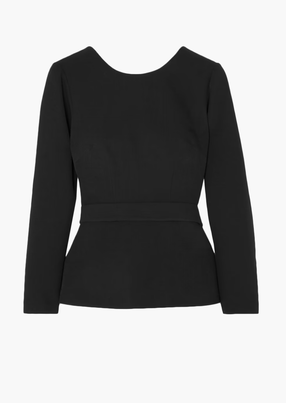 This elegant top by Safiyaa is crafted from structured crepe with a subtle stretch for a refined, figure-flattering fit. The dramatic draping in the back make it an absolute show stopper. The detachable belt define the waist, while the removable insert adds versatility. Super versatile to dress up or down with tailored trousers or pairing it with an evening skirt. Perfect for understated elegance.