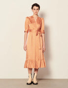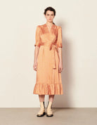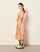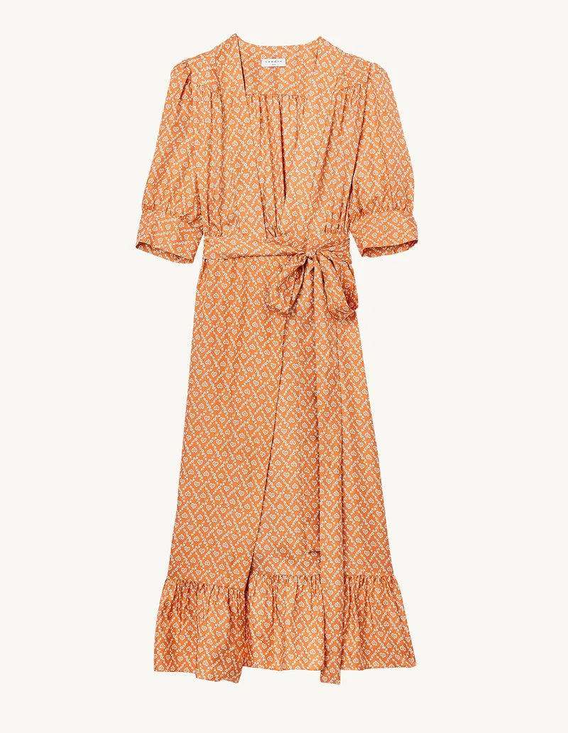 Lightweight chiffon with soft pleats and a flattering cross-front halter neckline. Vibrant floral print in amber, blush, and lilac. Flows beautifully with every step — ideal for weddings, garden parties, or holiday dinners.