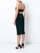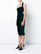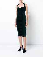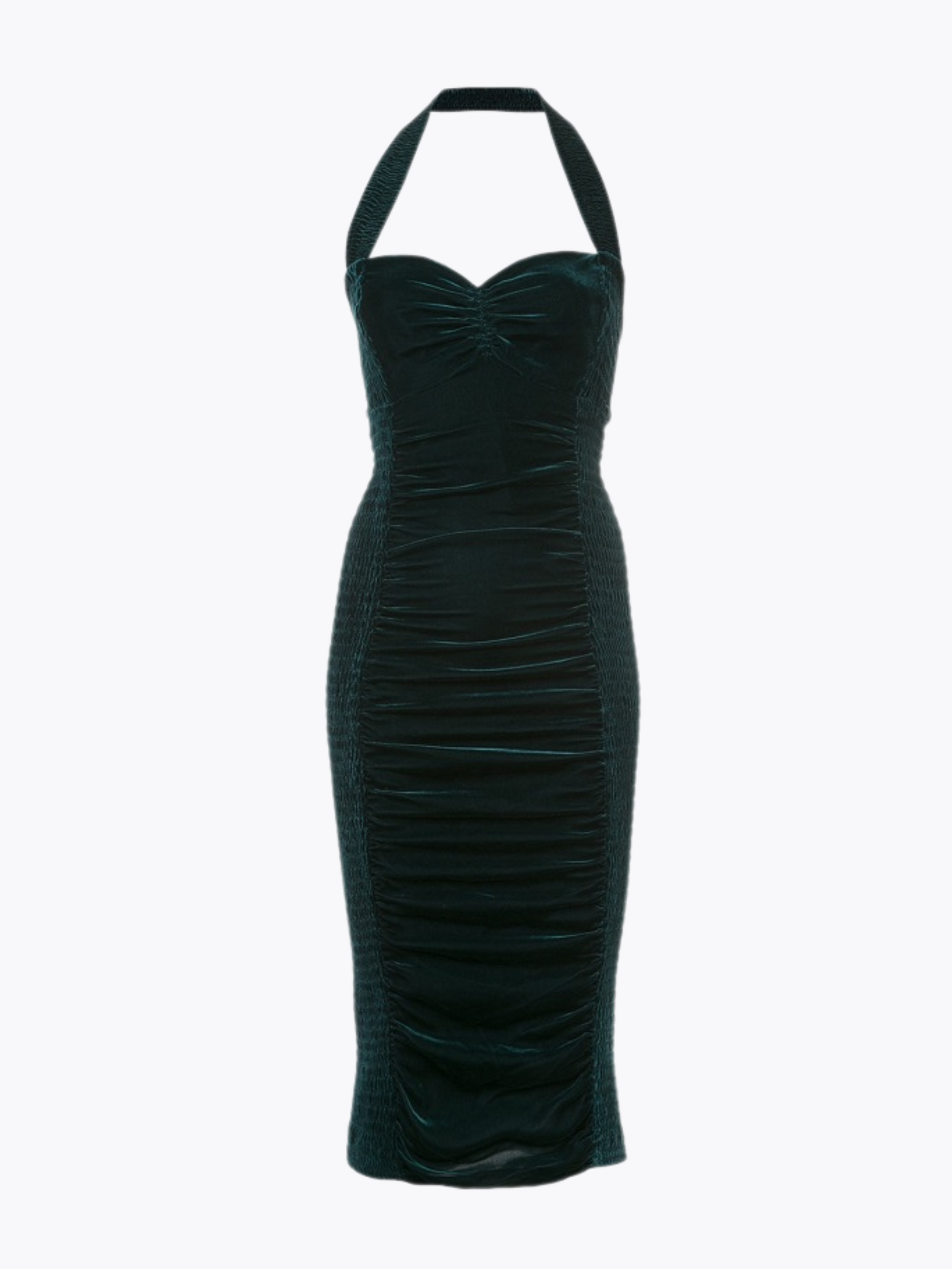 Soft velvet midi dress featuring a flattering halter neckline, pleated front, and shirred ruching effect that beautifully enhances the silhouette.