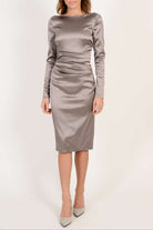 Expertly tailored to accentuate the silhouette, it features a flattering ruched waist and a stunning open back with a bow detail for a feminine finish. The shimmering fabric adds a sophisticated glow, perfect for cocktail parties, evening events, or special occasions. Only been worn once so far.