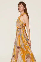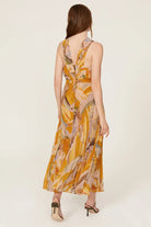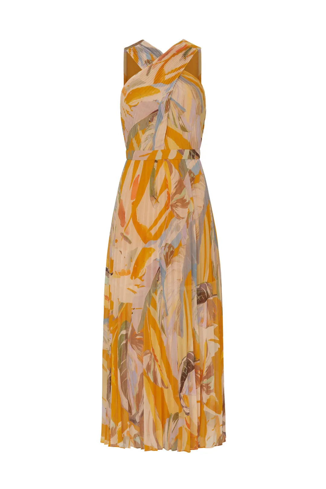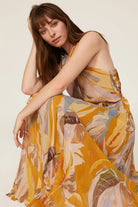 Lightweight chiffon with soft pleats and a flattering cross-front halter neckline. Vibrant floral print in amber, blush, and lilac. Flows beautifully with every step — ideal for weddings, garden parties, or holiday dinners.