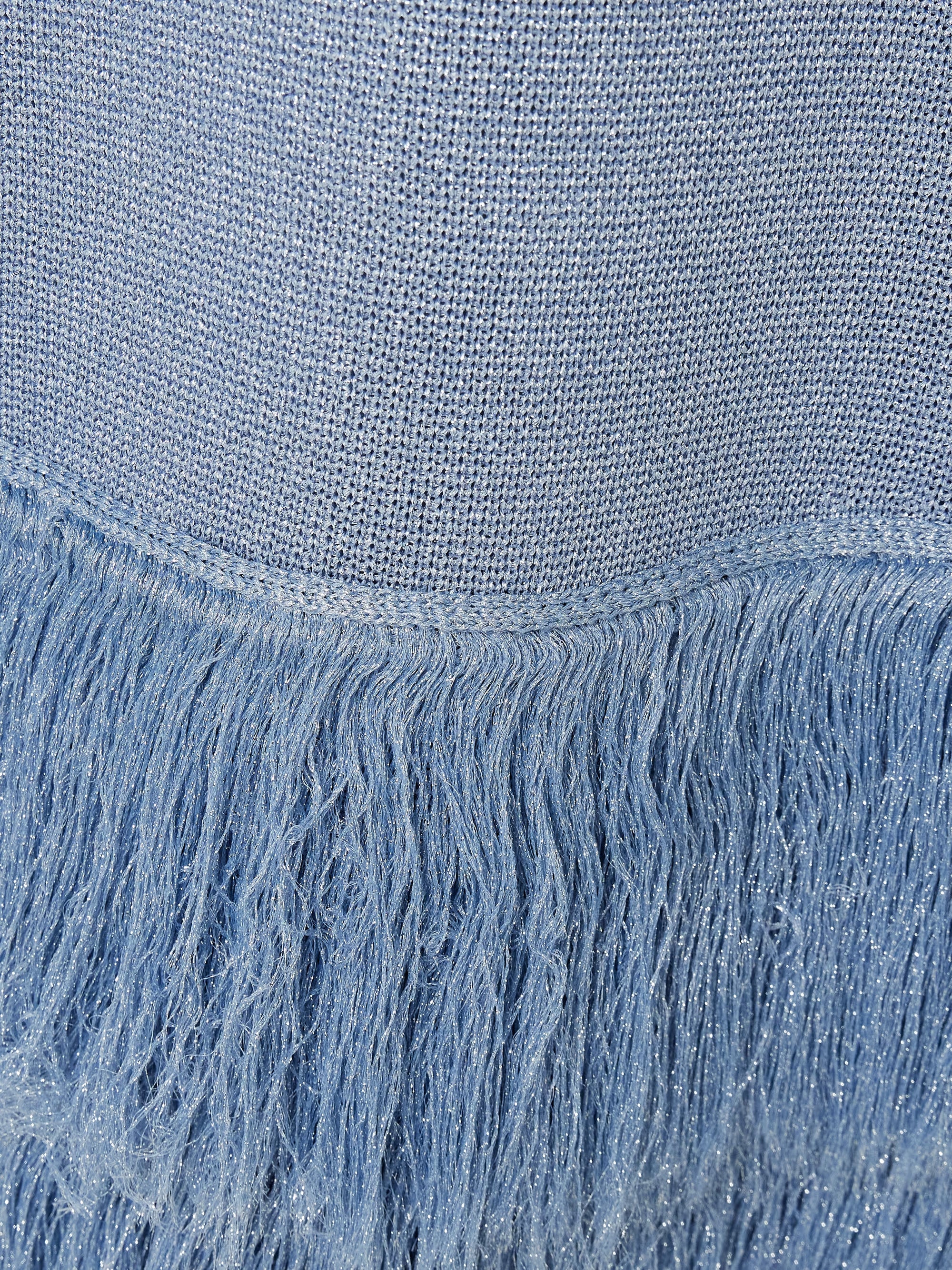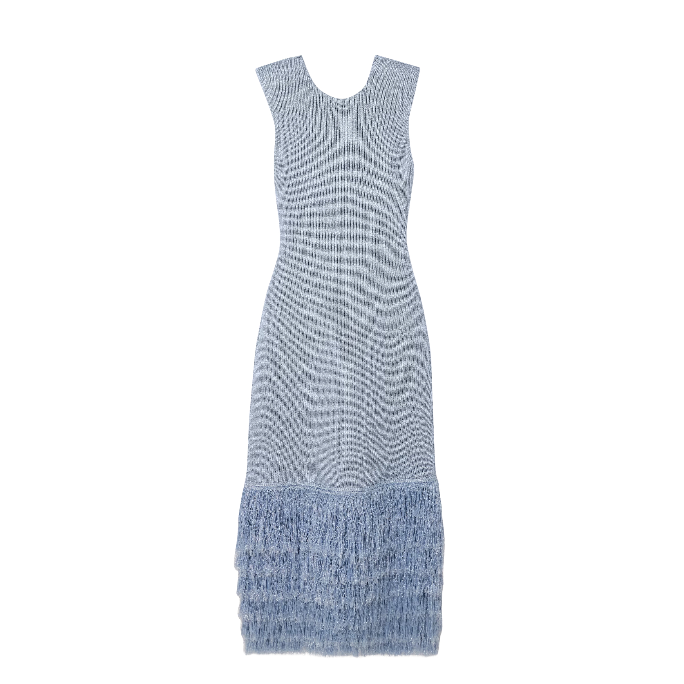 A soft shimmer meets playful texture in the Breeze Fringed Metallic Knitted Midi Dress by Aje. Crafted in a pale blue metallic knit, this sleeveless silhouette skims the body before finishing with statement fringe that moves beautifully with every step. Perfect for cocktail parties, weddings, birthdays, rooftop dinners, and evening celebrations.