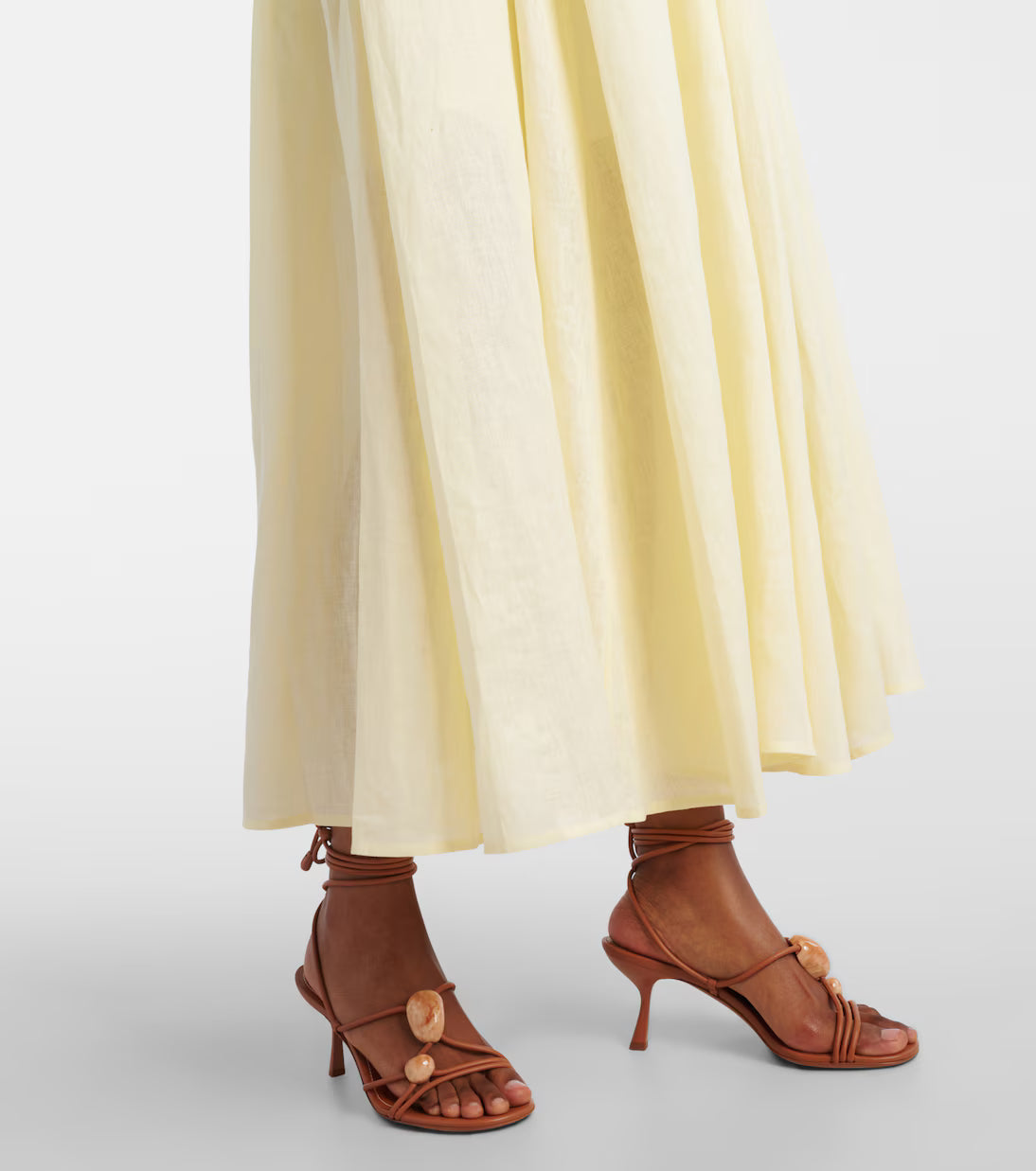 The Rhiannon Midi Dress by Zimmermann is a soft, romantic silhouette crafted in a delicate butter-yellow fabric. Featuring slim embellished straps and a softly draped bodice, the dress flows into a light, airy skirt that moves beautifully with every step. The gentle pastel tone and feminine shape make it perfect for summer weddings, garden parties, and elegant daytime celebrations.