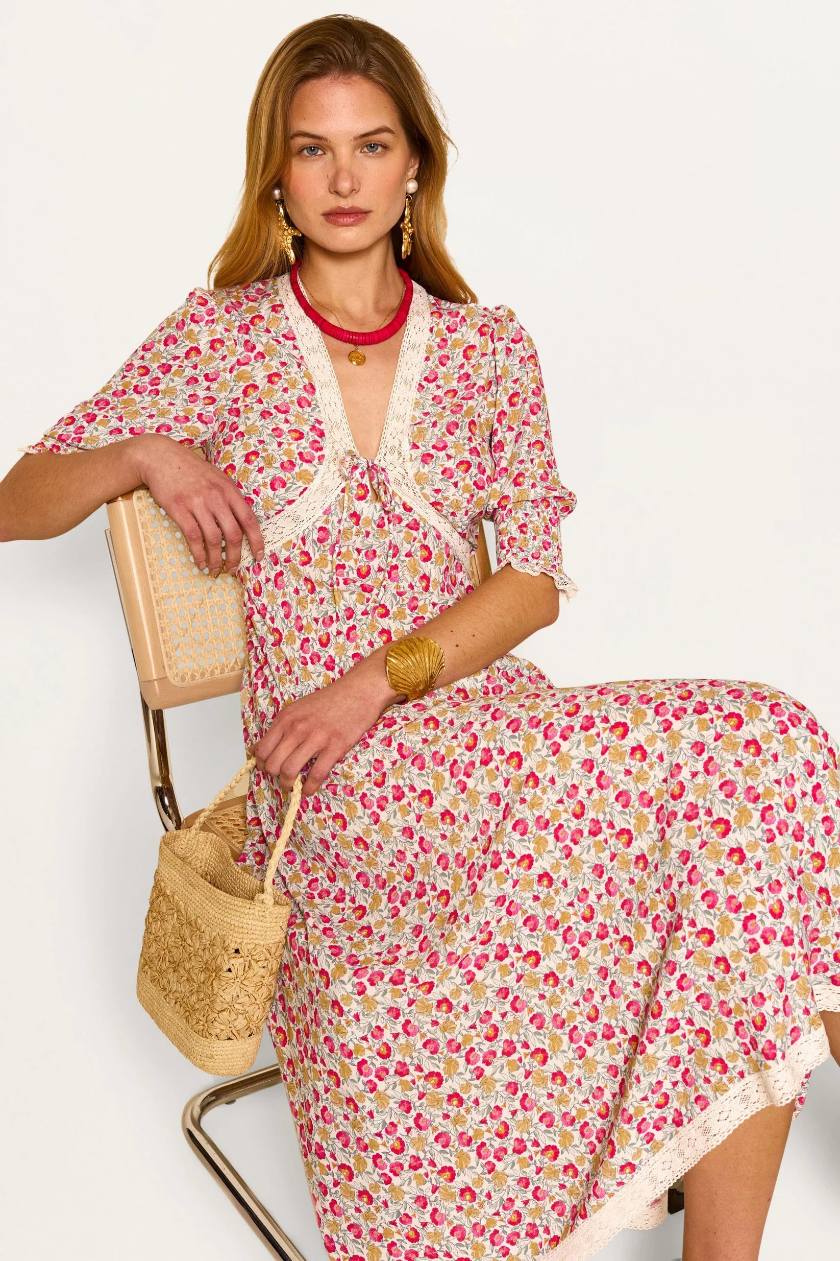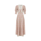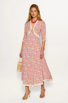 Romantic, feminine, and effortlessly chic the Amina midi dress captures timeless elegance with a modern twist. Crafted from airy fabric with a soft drape, it features a delicate all-over floral print in fresh pink and green hues, complemented by intricate lace trims that highlight the neckline, waist, and hem.