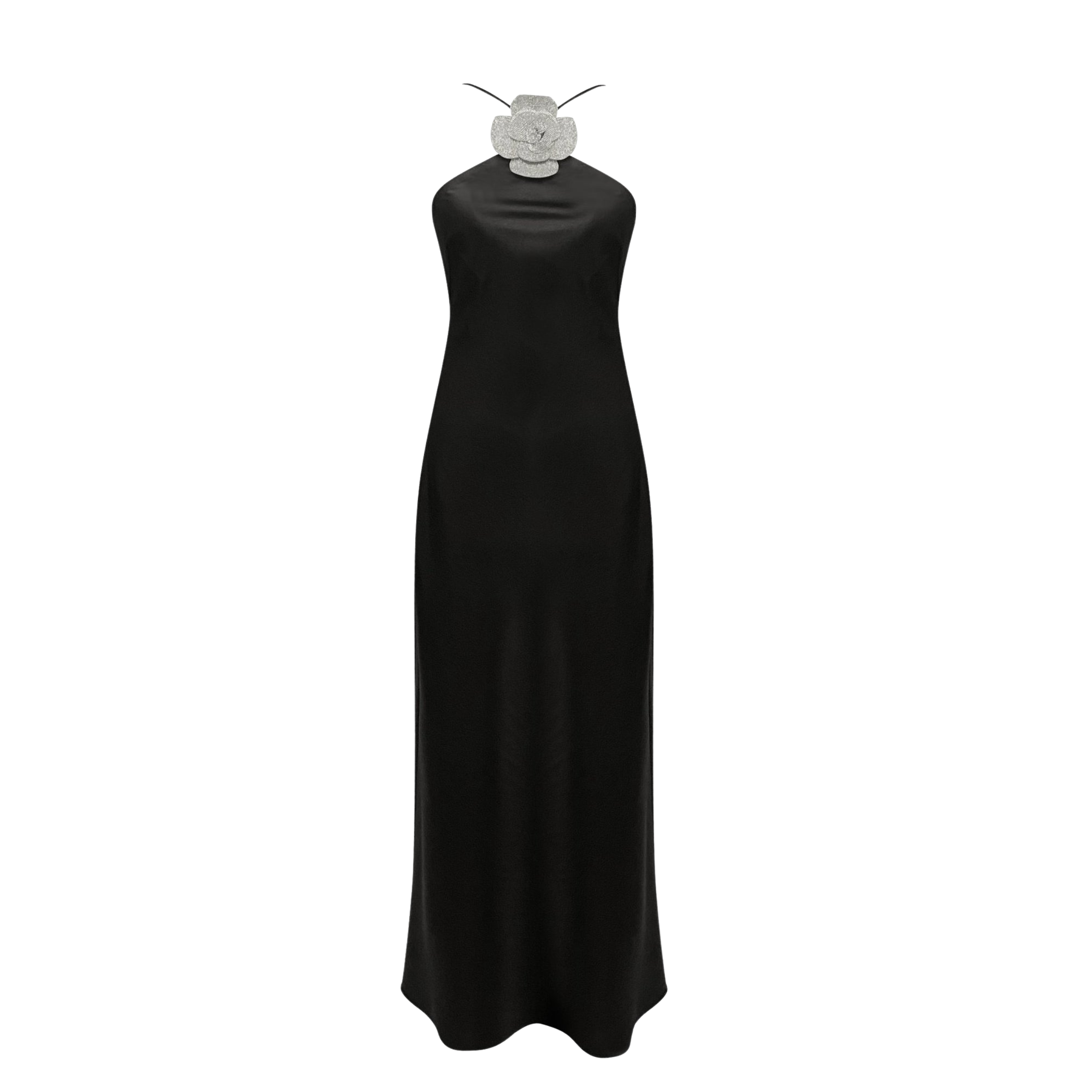Sleek, striking, and undeniably elegant, the Witsy Rose Dress by Gigiis is a modern evening silhouette elevated by a sculptural crystal rose detail. Cut in a fluid black satin, this gown skims the body with a refined halter-style neckline that draws attention upward to the statement floral embellishment. Minimal in shape yet rich in detail, it balances timeless sophistication with contemporary glamour.