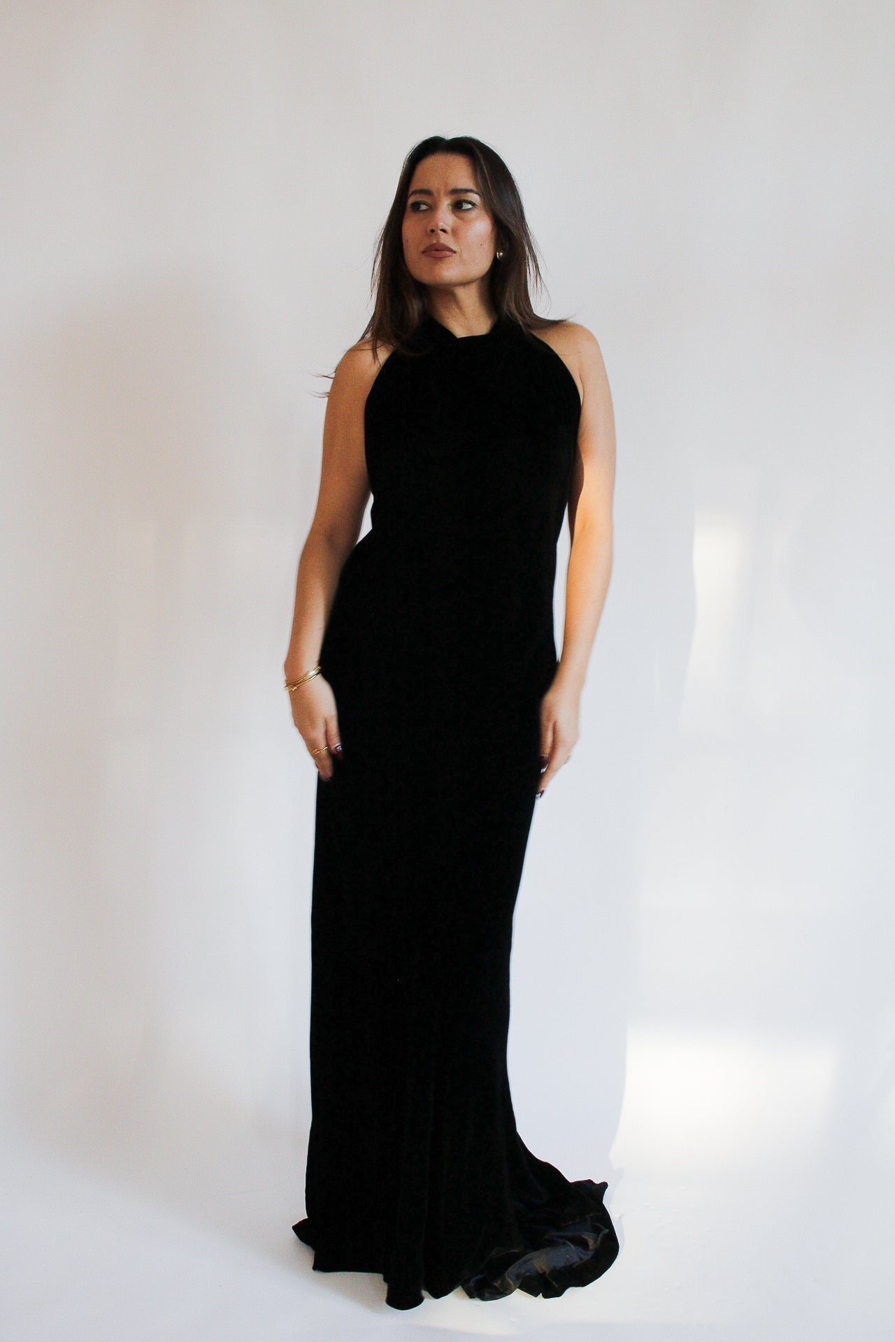 Timeless and quietly dramatic, this vintage Hermès black velvet gown is cut in a sleek halterneck silhouette with a fluid floor-length finish. The open back adds subtle allure, while the matching belt defines the waist beautifully. Perfect for black-tie events, formal dinners, weddings, galas, and elegant evening occasions.