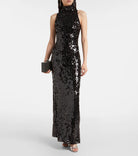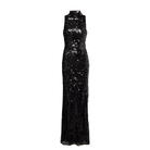 The Cristalla gown delivers pure after-dark glamour — a high-neck, sleeveless column drenched in glossy black sequins. Its clean, elongated silhouette feels sharp yet fluid, catching the light with every step and creating an undeniably modern, red-carpet mood.