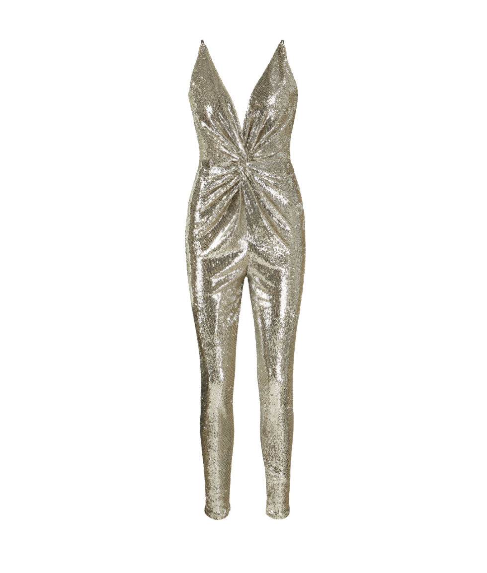 Turn heads in this show-stopping silver jumpsuit, designed to dazzle. Featuring a deep V-neck, cinched waist, and fluid wide-leg pants, its lustrous metallic finish ensures all eyes are on you.