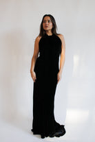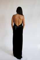 Lean into the gown’s understated elegance with barely-there heels and a sculptural clutch. Gold or silver jewelry works effortlessly against the velvet texture. For a modern rental mix, style it with statement earrings and keep everything else minimal and let the silhouette do all the work.