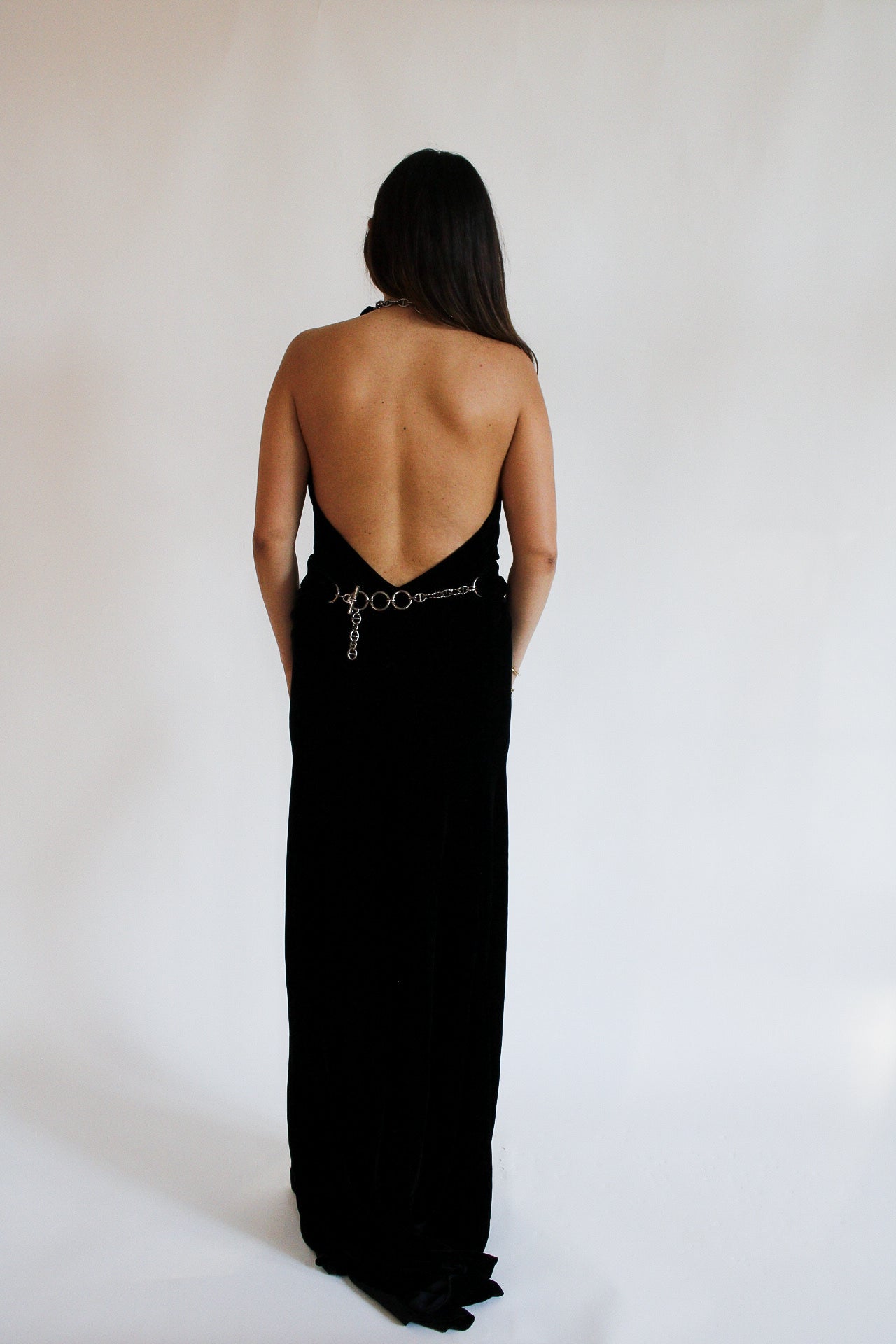 Timeless and quietly dramatic, this vintage Hermès black velvet gown is cut in a sleek halterneck silhouette with a fluid floor-length finish. The open back adds subtle allure, while the matching belt defines the waist beautifully. Perfect for black-tie events, formal dinners, weddings, galas, and elegant evening occasions.