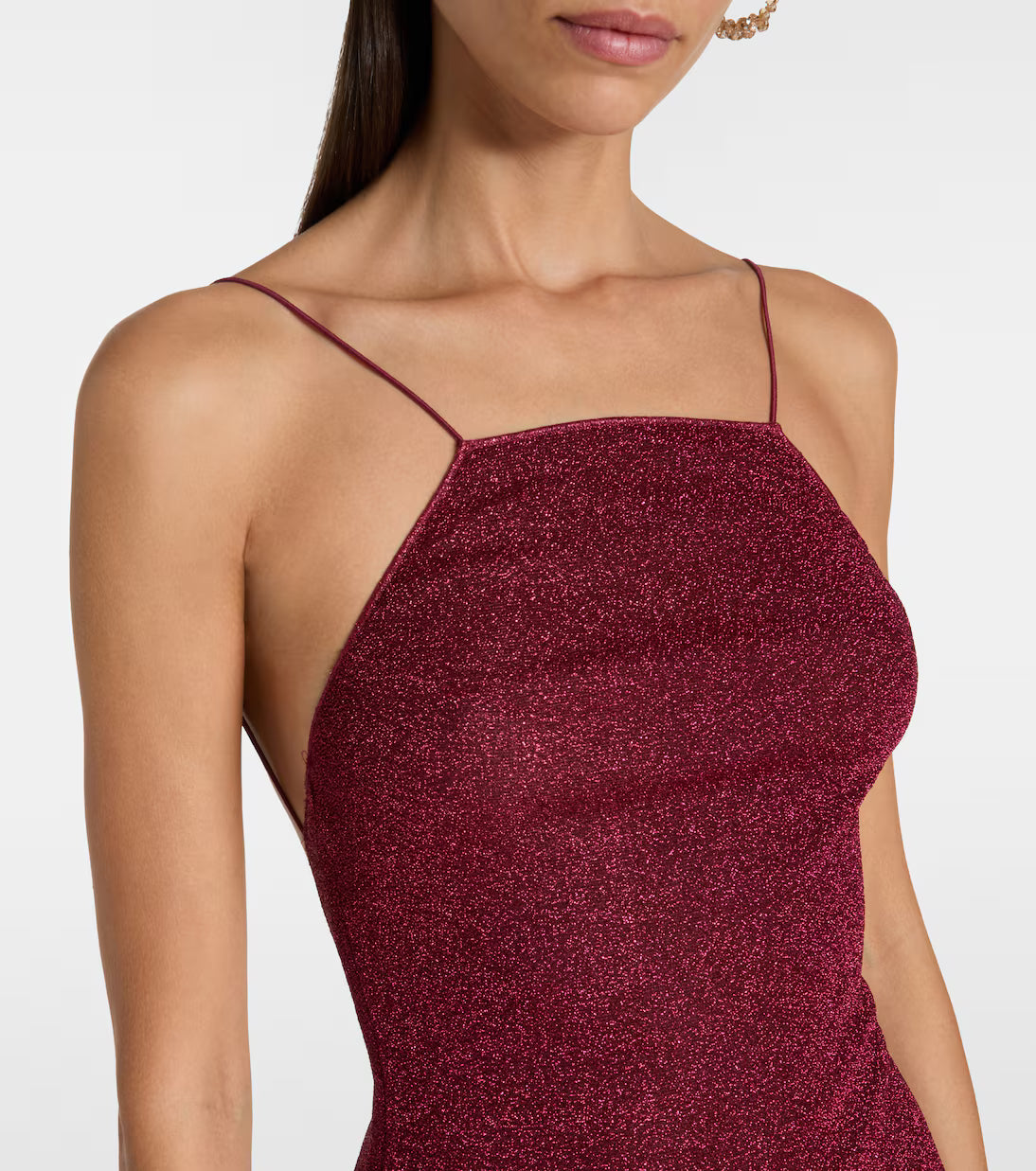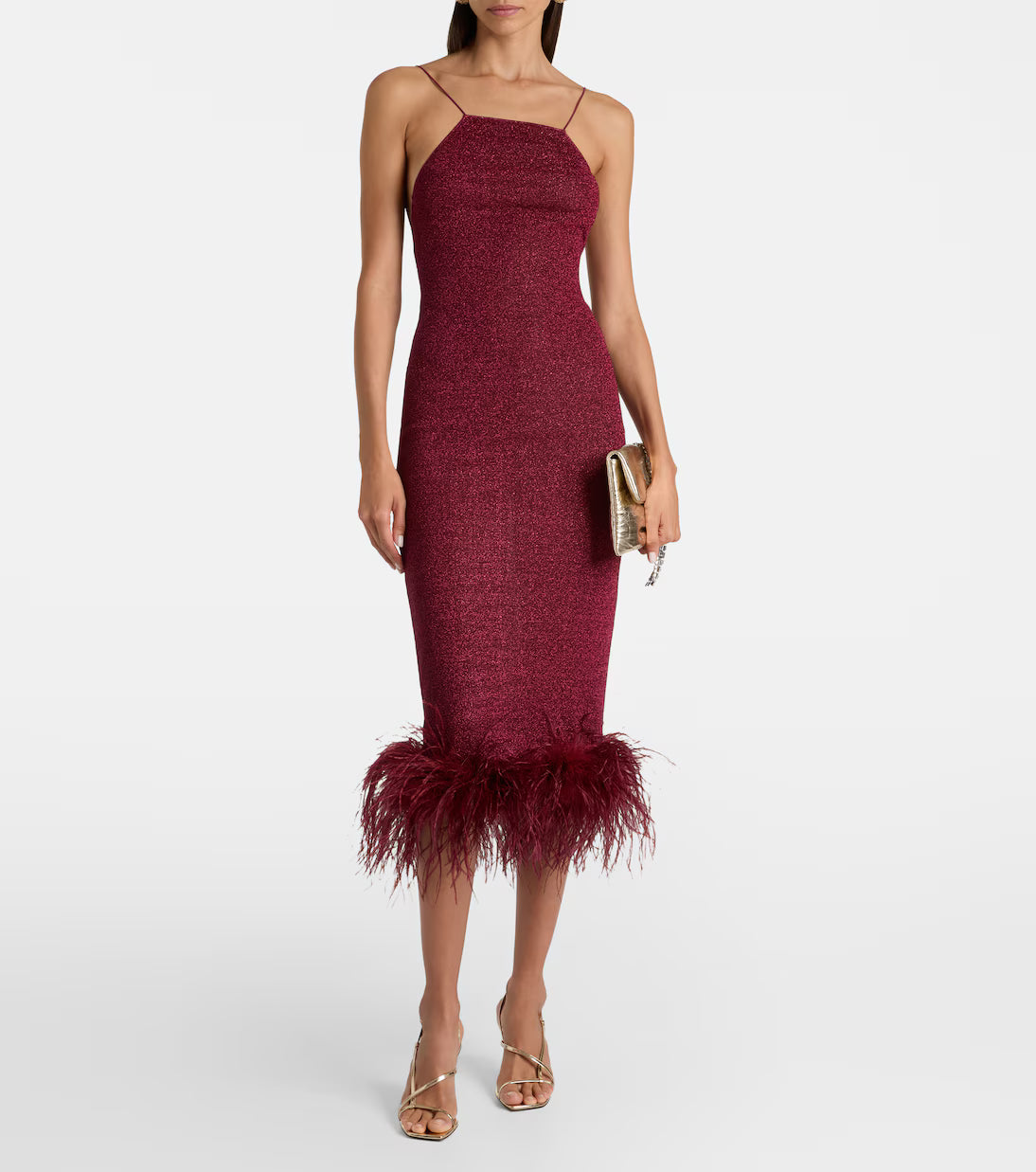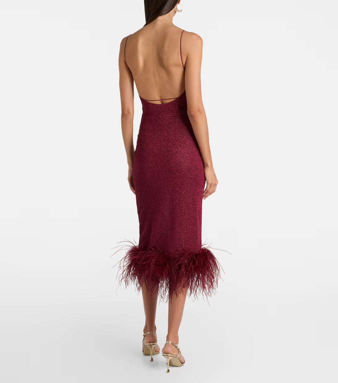 Made in Italy, the Lumière maxi dress by Oséree is covered with feathers at the hem. This design features thin straps and has a figure-hugging silhouette.