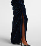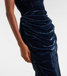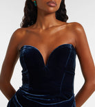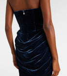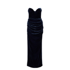 A midnight-navy velvet gown with a sculpted strapless bodice and romantic draping that falls into a fluid, floor-skimming silhouette. The plush texture and deep jewel tone give it a rich, cinematic presence — perfect for gala nights, black tie events, festive evenings, winter weddings, and elevated evening events.