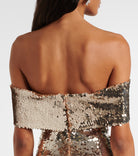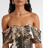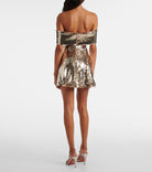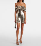 Shine with effortless glamour in this Self-Portrait off-shoulder mini dress adorned with gold sequins. The fitted silhouette and flirty mini length highlight the figure, while the off-shoulder design adds a touch of modern sophistication. Perfect for women who want to make a statement, this dress balances festive sparkle with elegant tailoring for a look that is both chic and unforgettable.