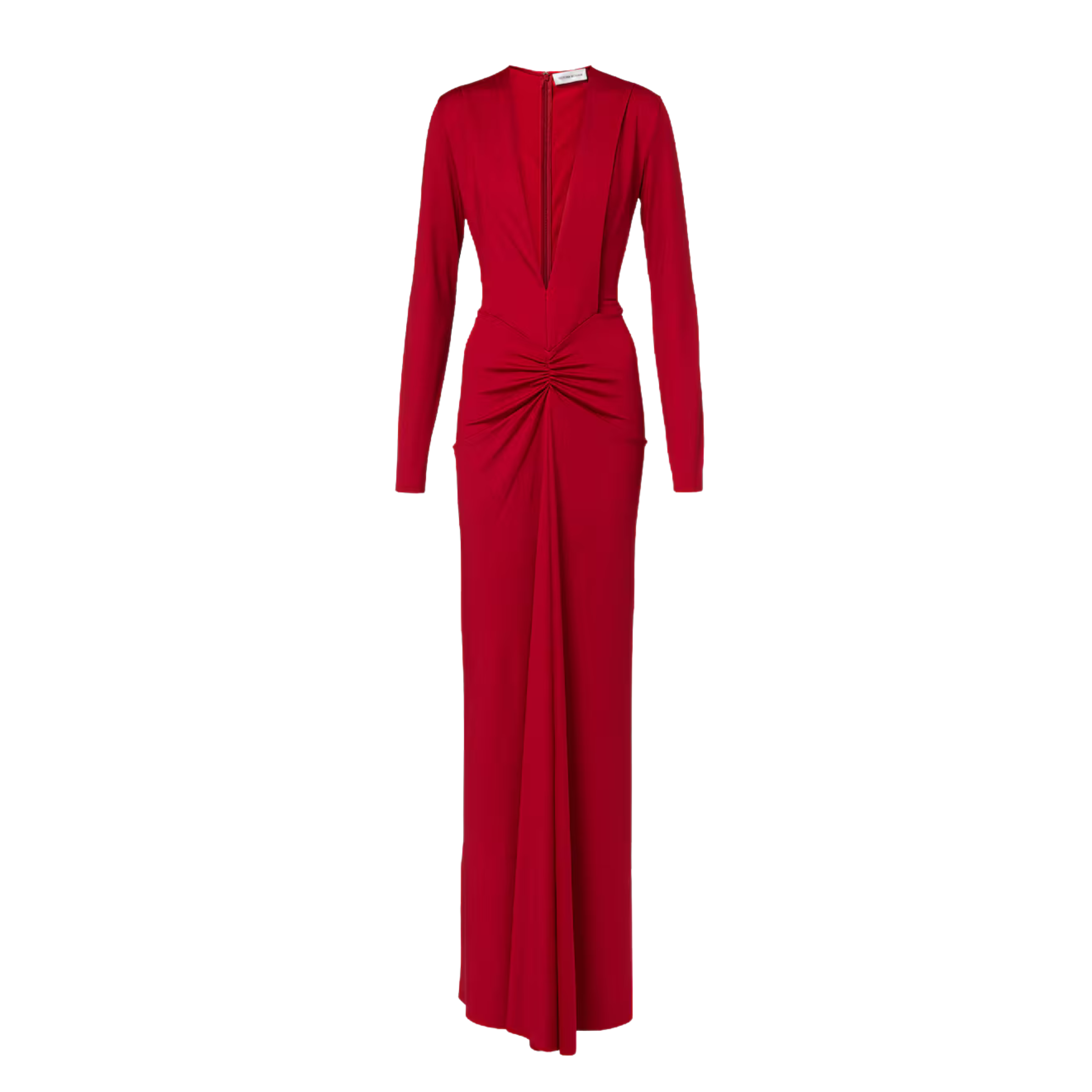 Victoria Beckham's brand of the same name features chic, confident styles like this robe. The long-sleeved silhouette with a deep V-neck and gathered details in the middle exudes timeless elegance.