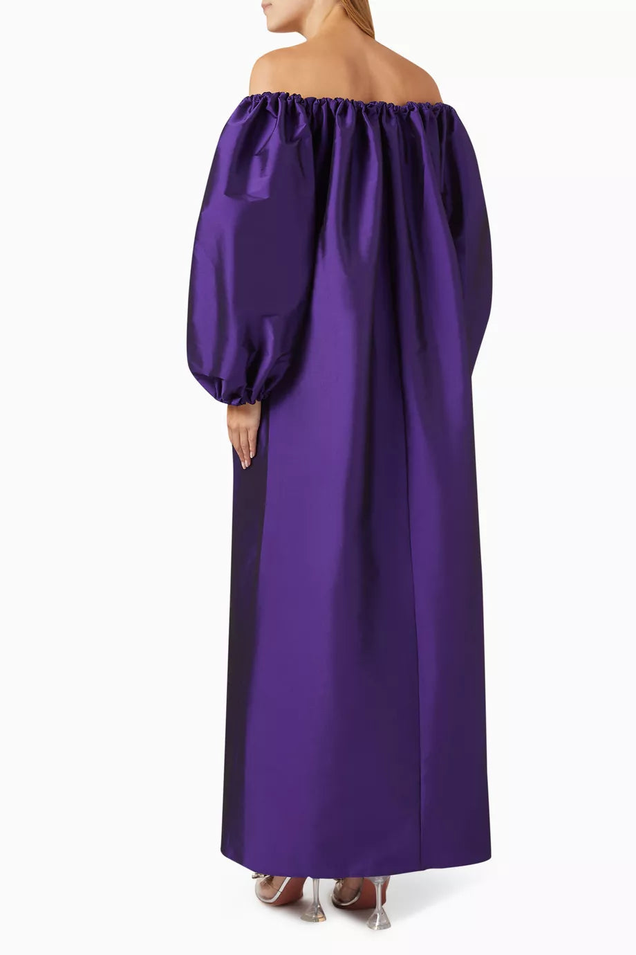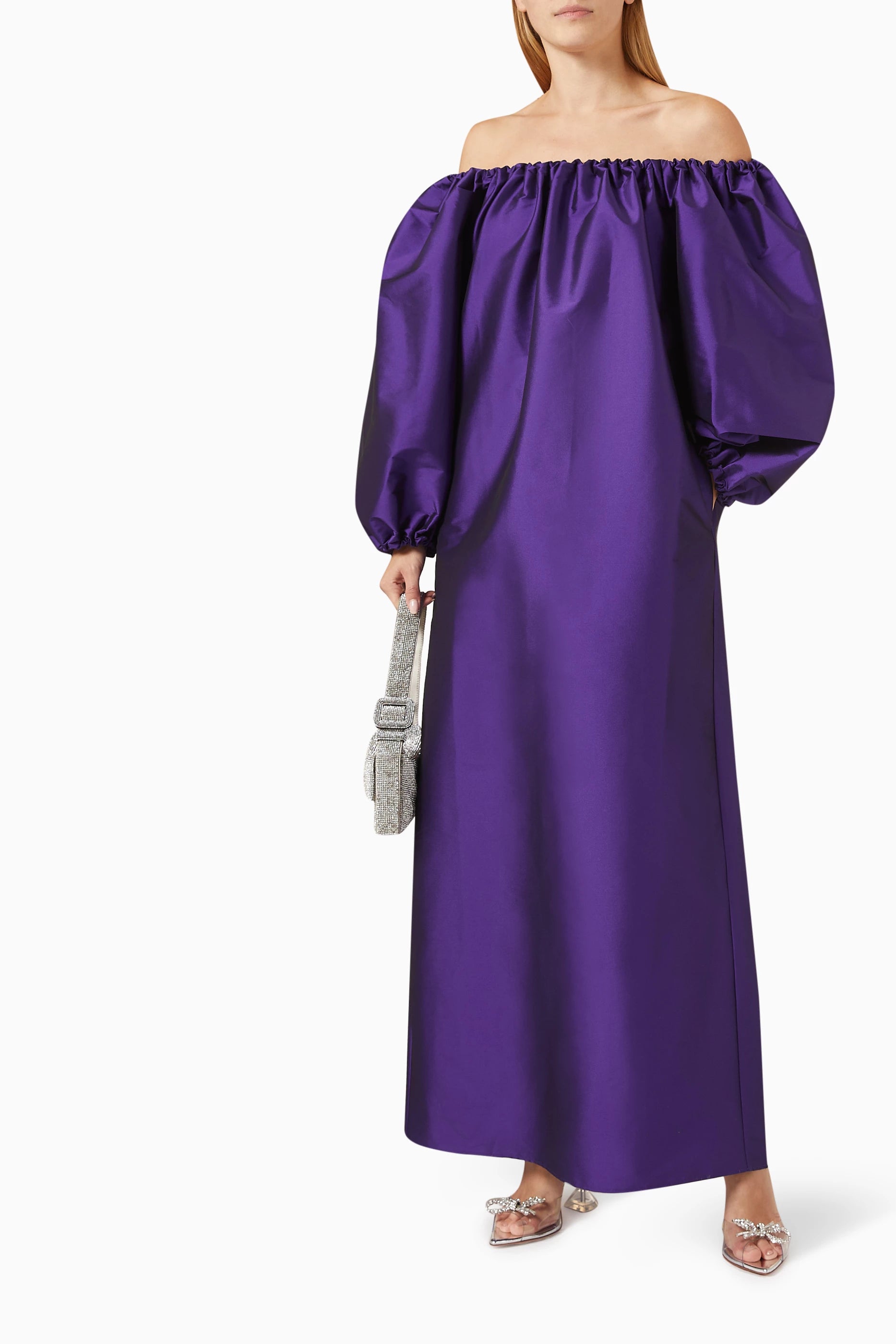 The Bernadette Bobby Off-Shoulder gown is pure statement minimalism. Cut in a rich violet hue with a softly gathered neckline and voluminous elbow-length sleeves, it falls into a clean, floor-grazing silhouette that feels both regal and modern. Perfect for black-tie events, formal weddings, gala dinners, milestone birthdays, and elegant evening receptions.
