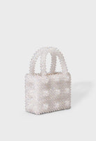The Mini Antonia Bag by Shrimps is a sparkling statement in iridescent white beads. Handcrafted with a structured silhouette and sculptural top handle, it catches the light from every angle. Perfect for bridal looks, weddings, engagement parties, cocktail events, birthdays, and black-tie celebrations.