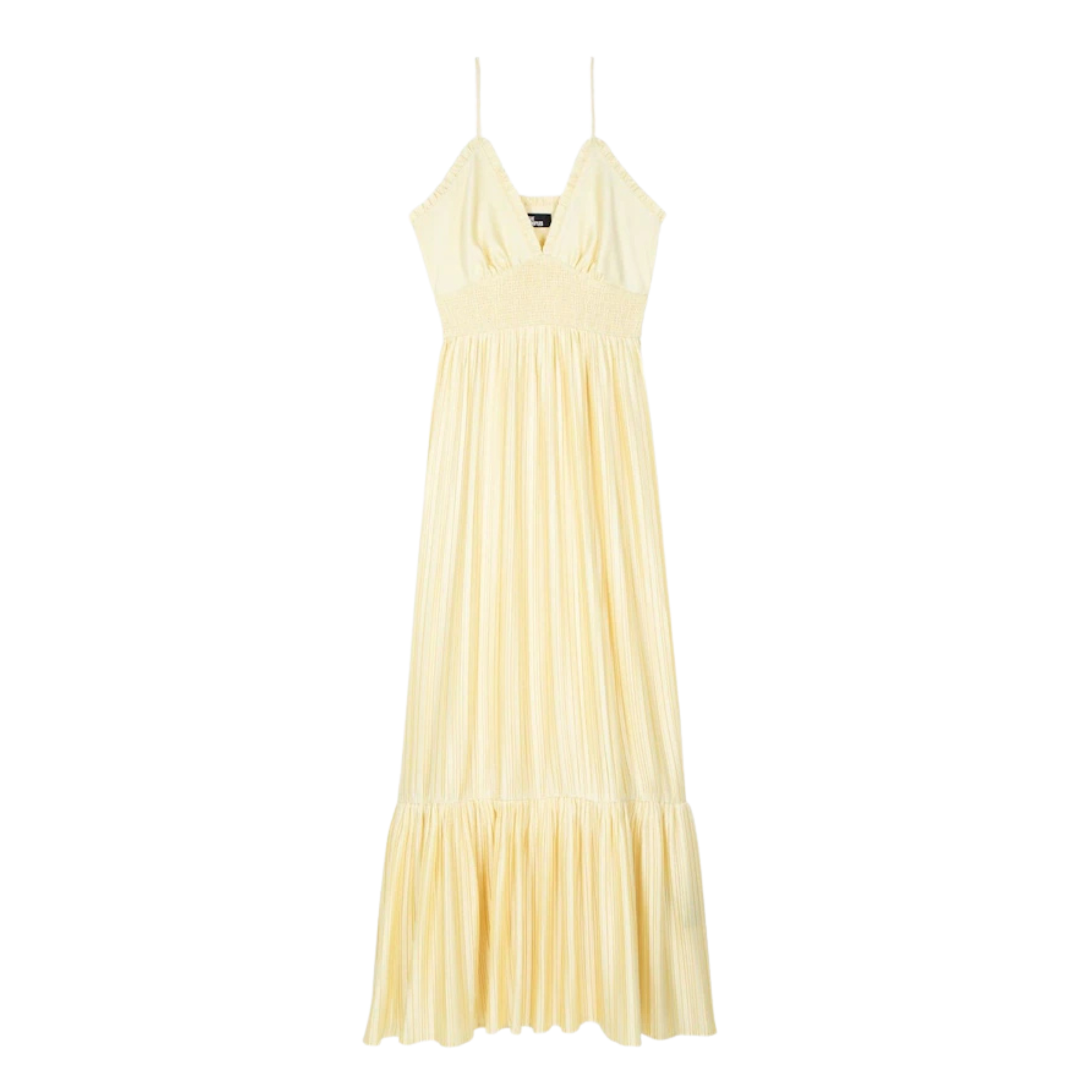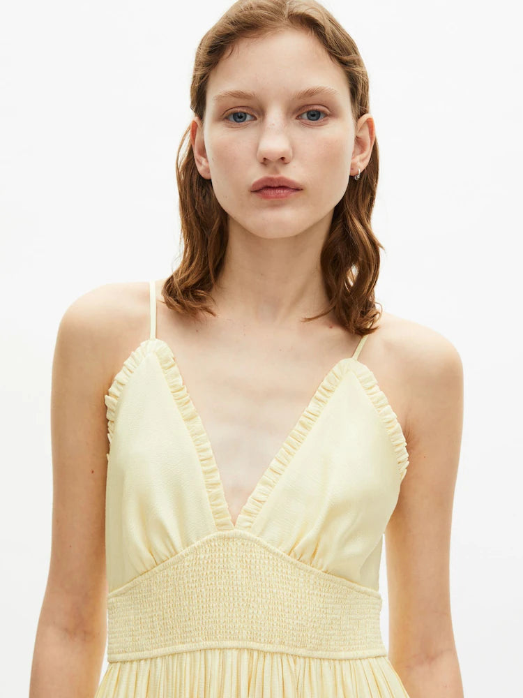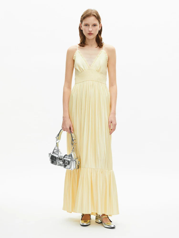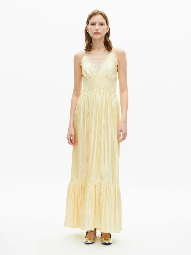 The Yellow V-Neck Sheered Waist Cami Maxi Dress by The Kooples blends soft femininity with effortless elegance. Designed with delicate straps, a flattering V-neckline, and a softly sheered waist that defines the silhouette, it flows into a graceful maxi skirt. Perfect for weddings, garden parties, summer soirées, engagement celebrations, date nights, and destination events.